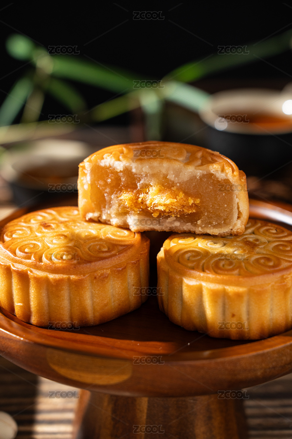 木纹桌上的月饼