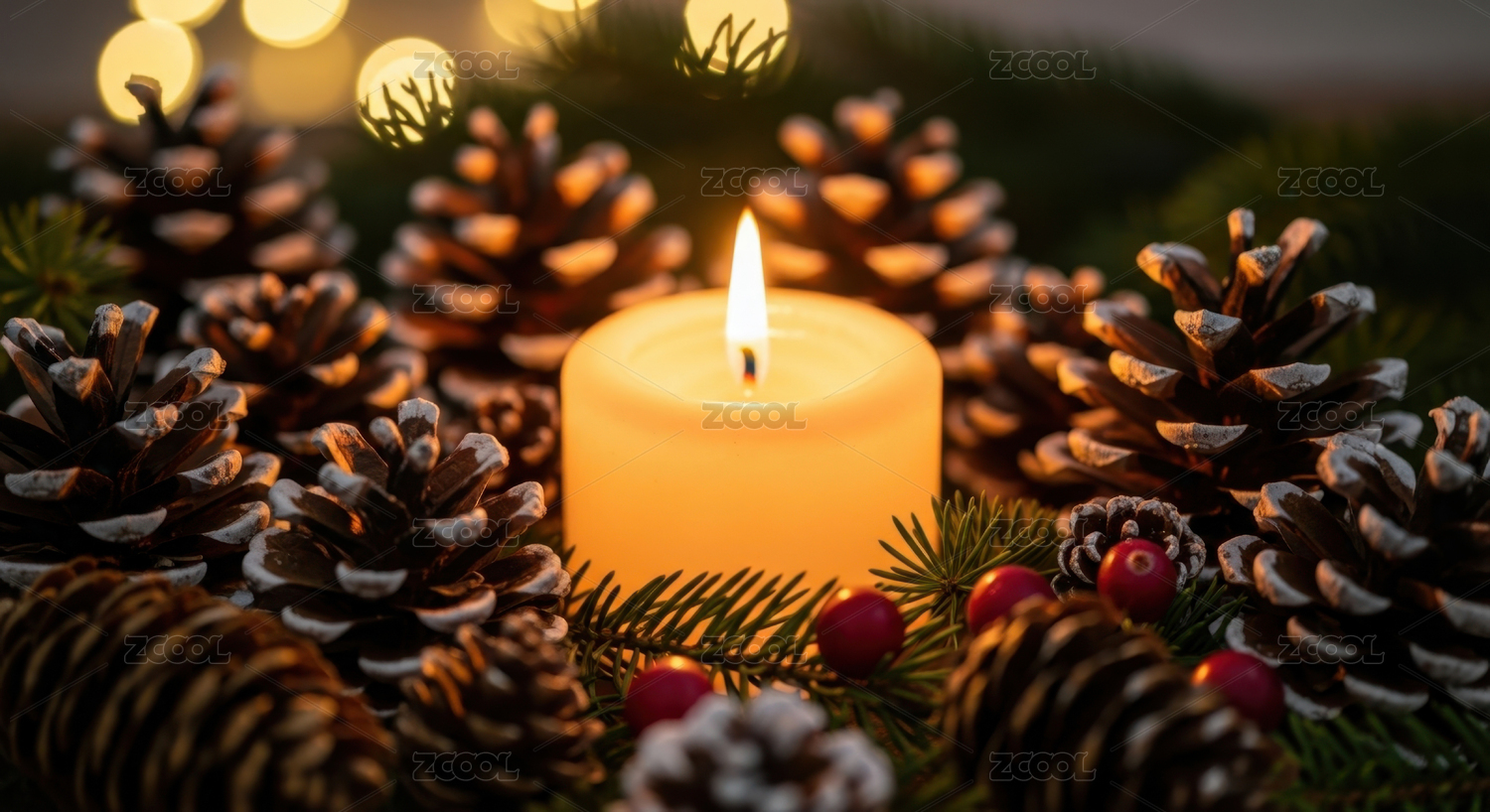 桌子上用松果和常绿树枝点燃蜡烛高清图片