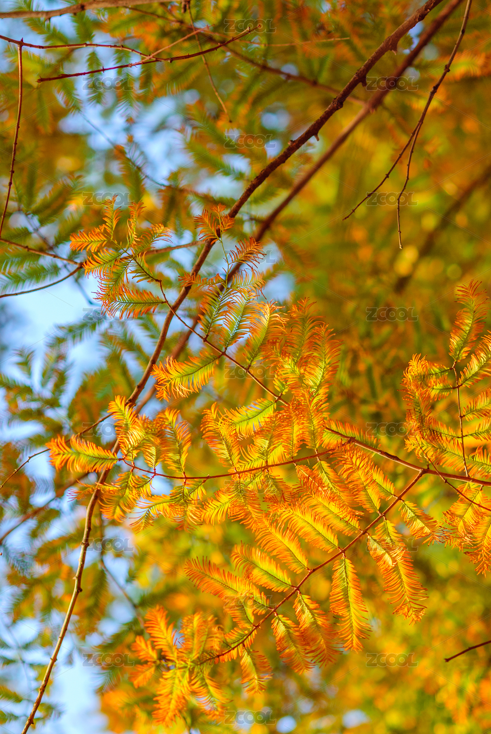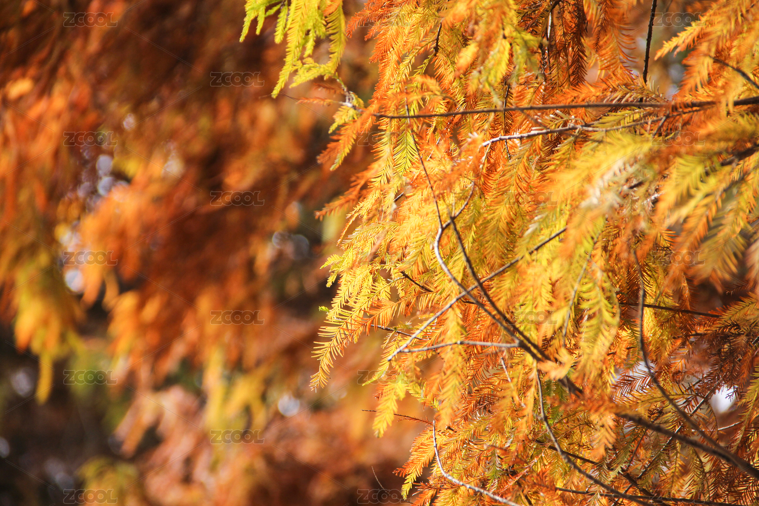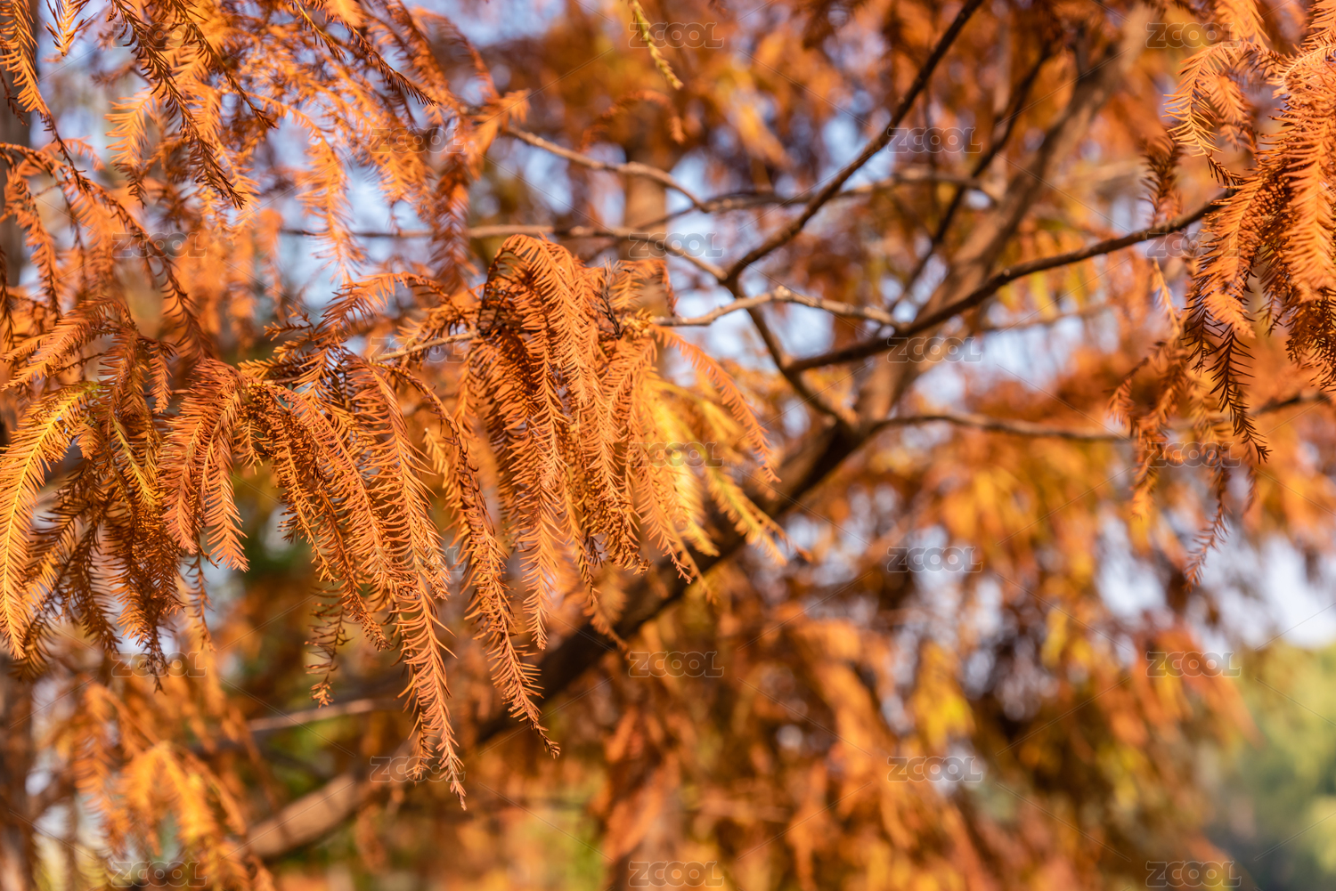 秋天晴天阳光下的落羽杉红色叶子枝条特写
