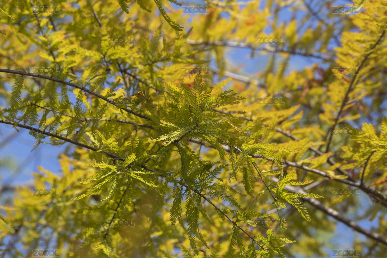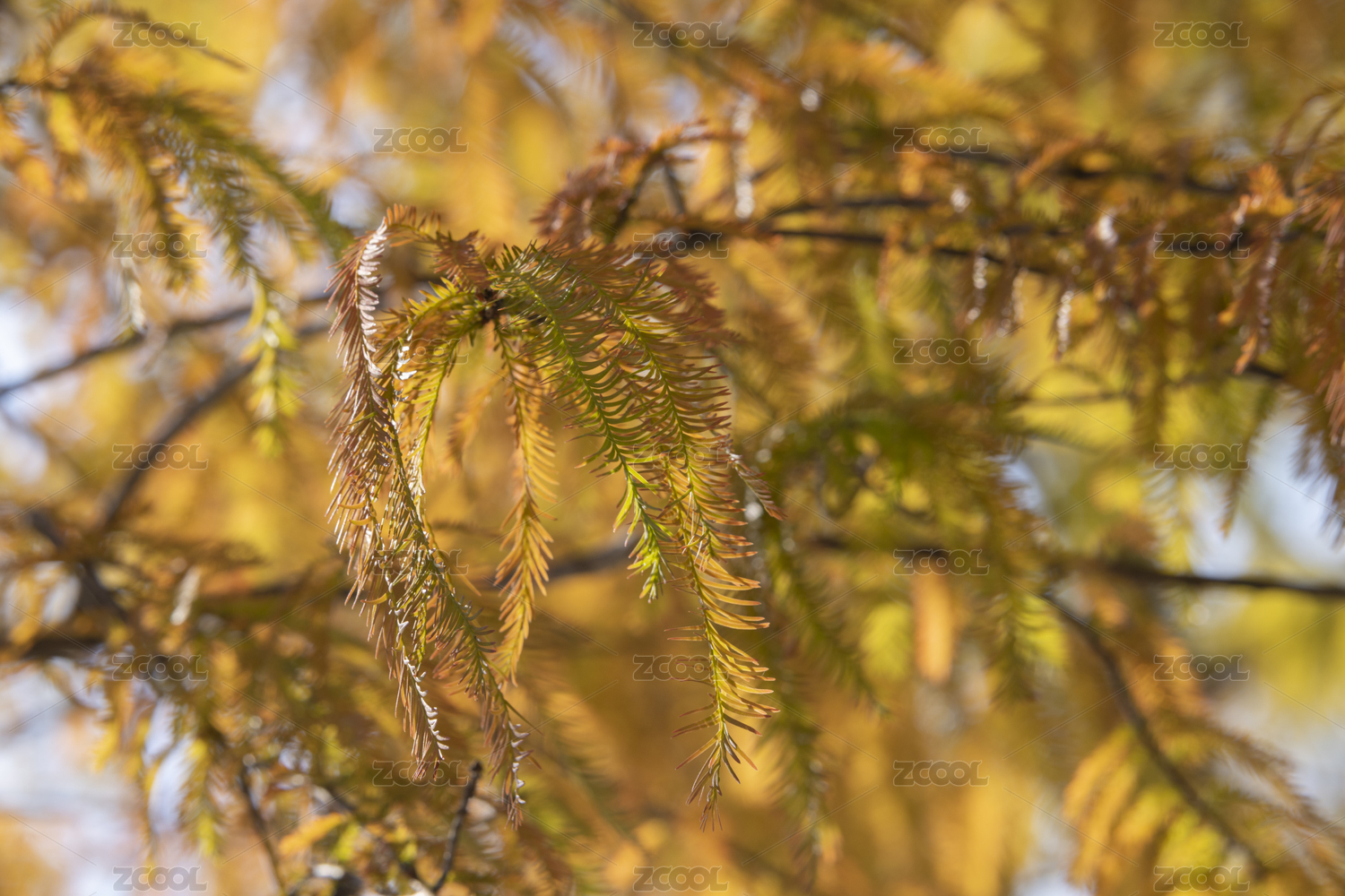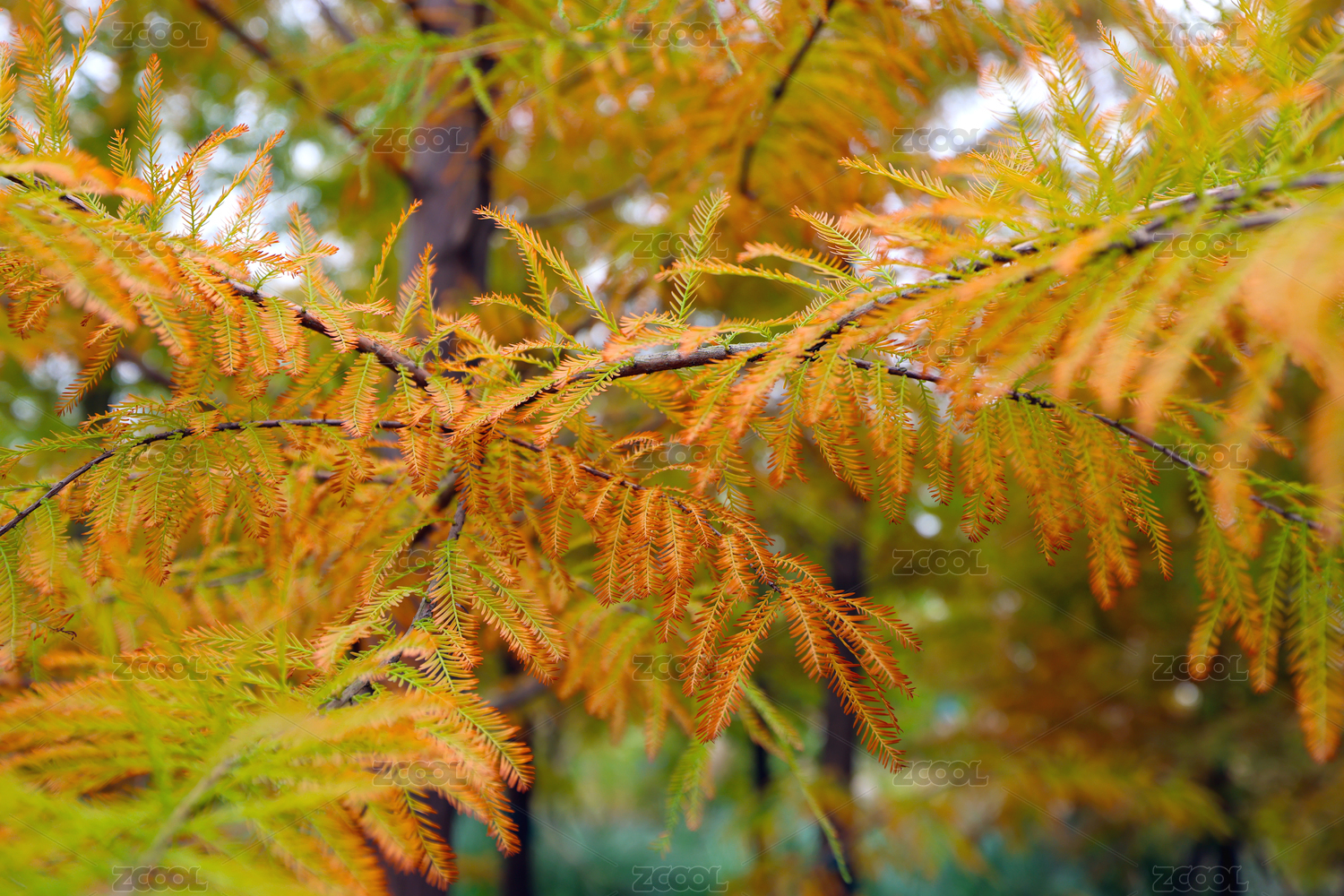 秋天晴天阳光下的落羽杉红色叶子枝条特写