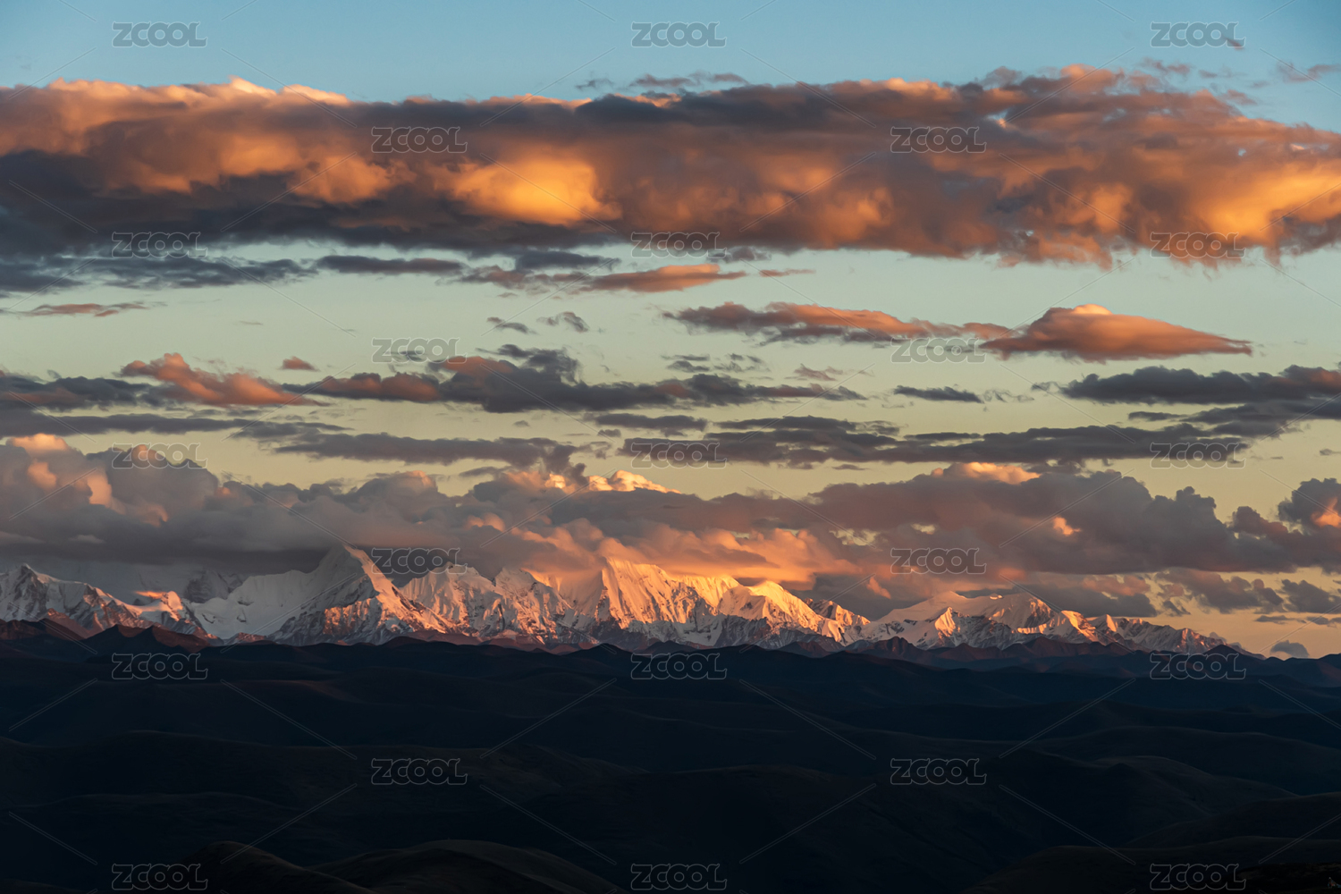 中国四川甘孜州鱼子西看日落、雪山