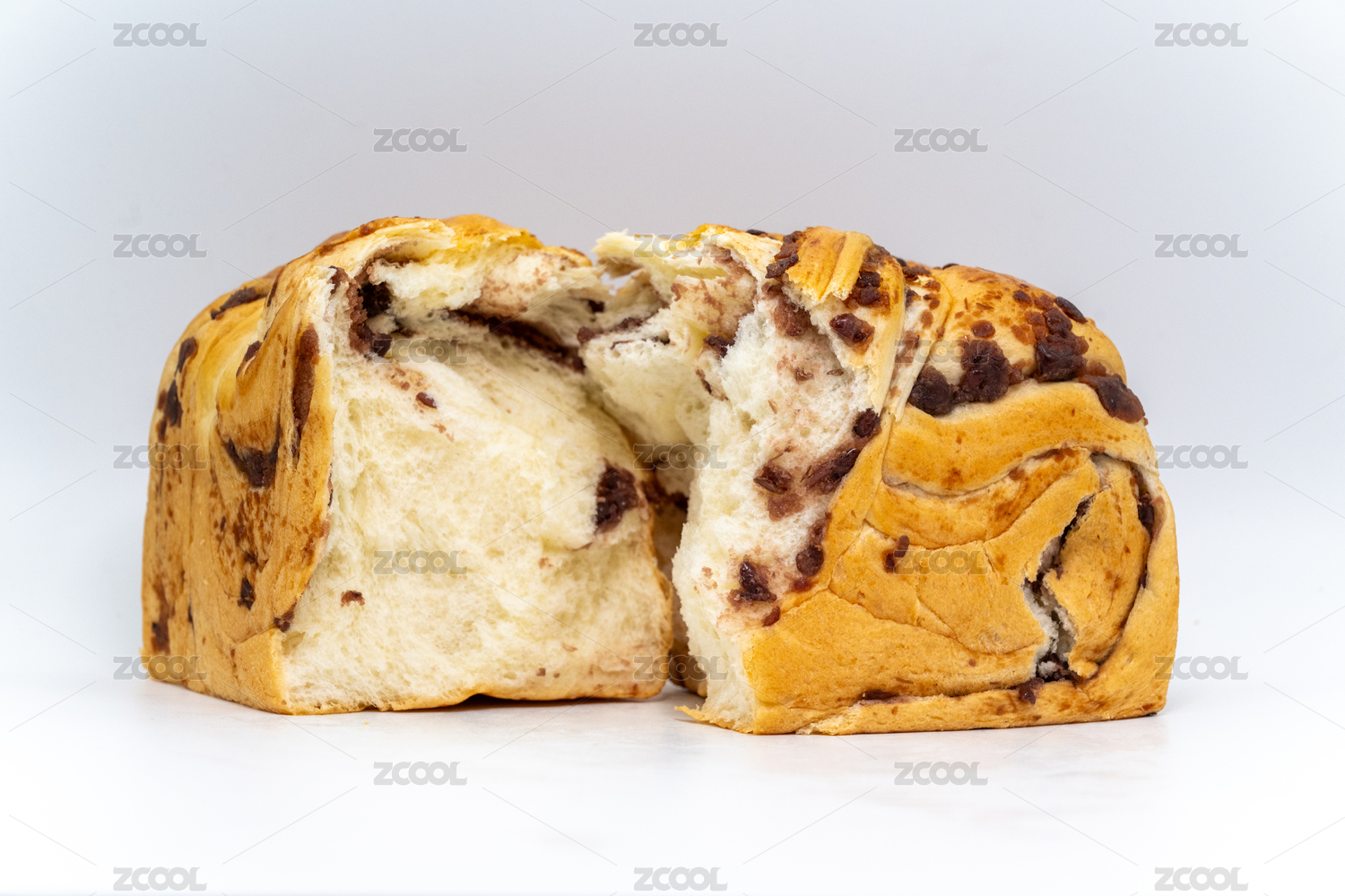 白色背景上的切面半个剖面红豆夹心现烤面包