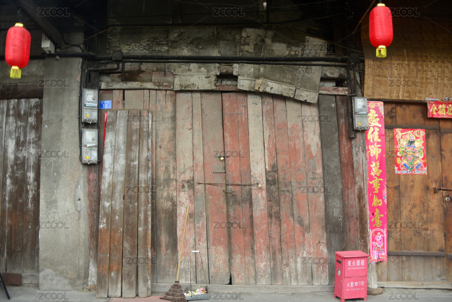 仰拍青砖灰瓦装饰的传统民居木质大门
