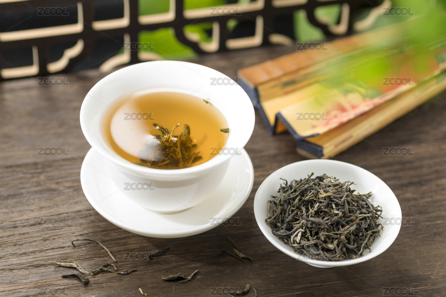 白色中国瓷器盖碗茶茶杯冲泡红茶场景,在原木色桌面上,有很多茶叶