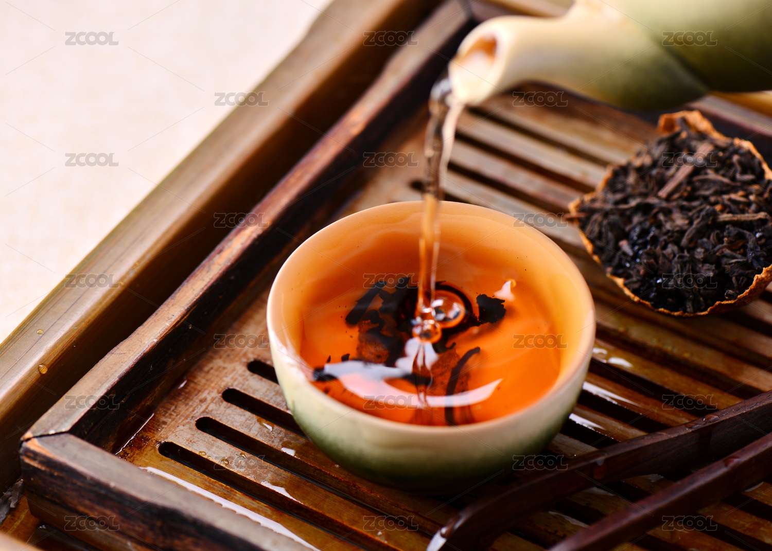 中式茶席上木托盘里的白瓷杯里的茶汤