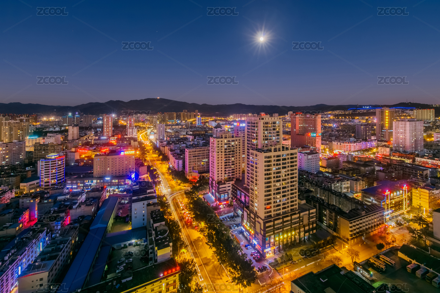 中国云南省玉溪市夜晚城区高楼大厦建筑