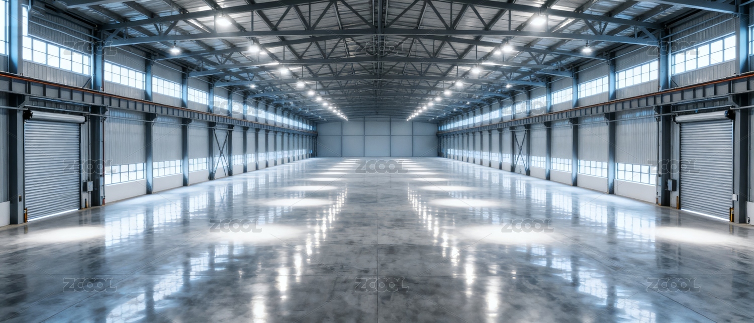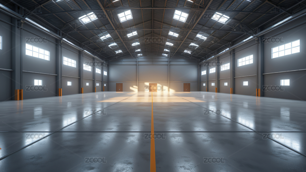 阳光下现代宽敞明亮的工厂仓库室内空间