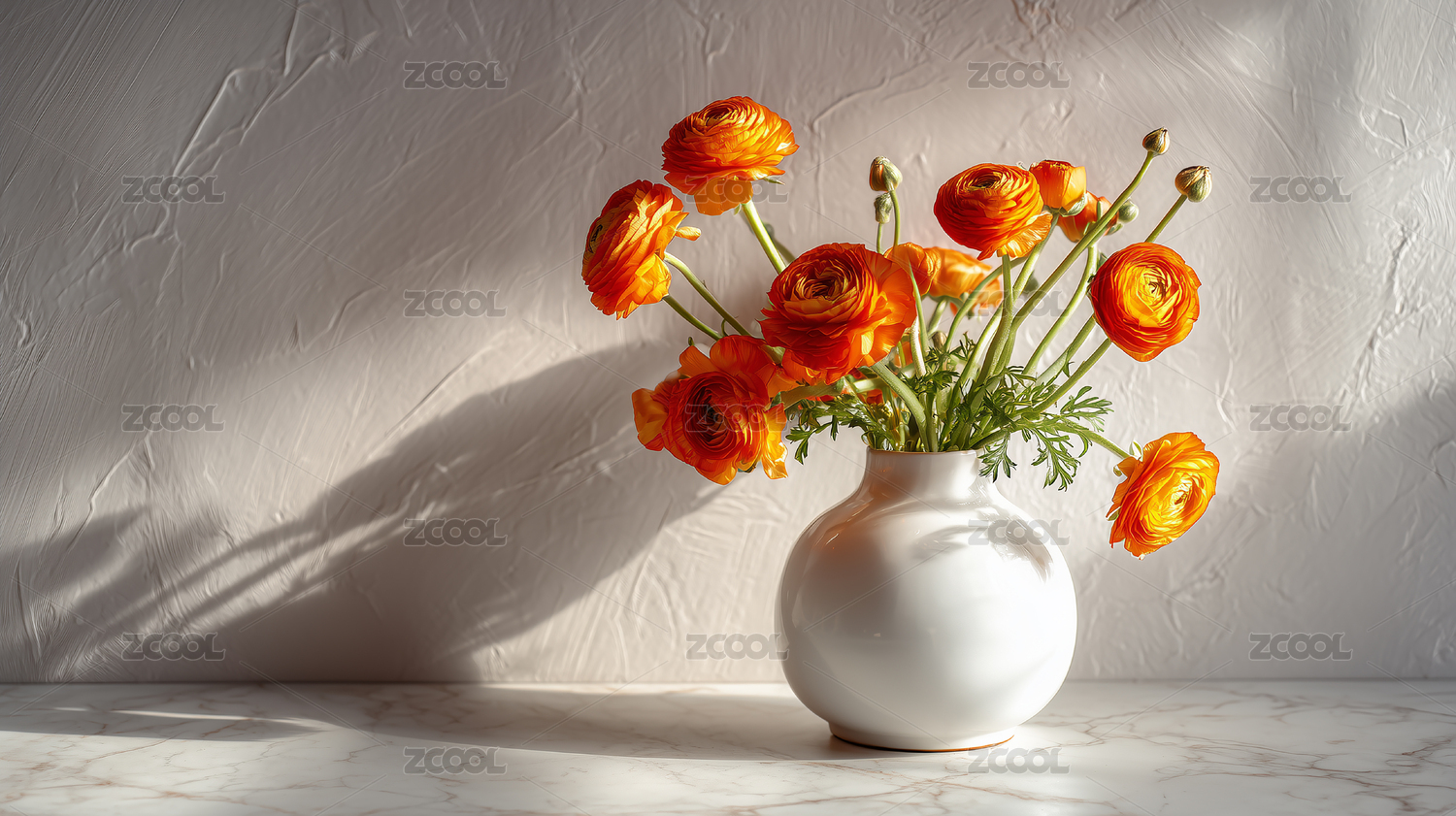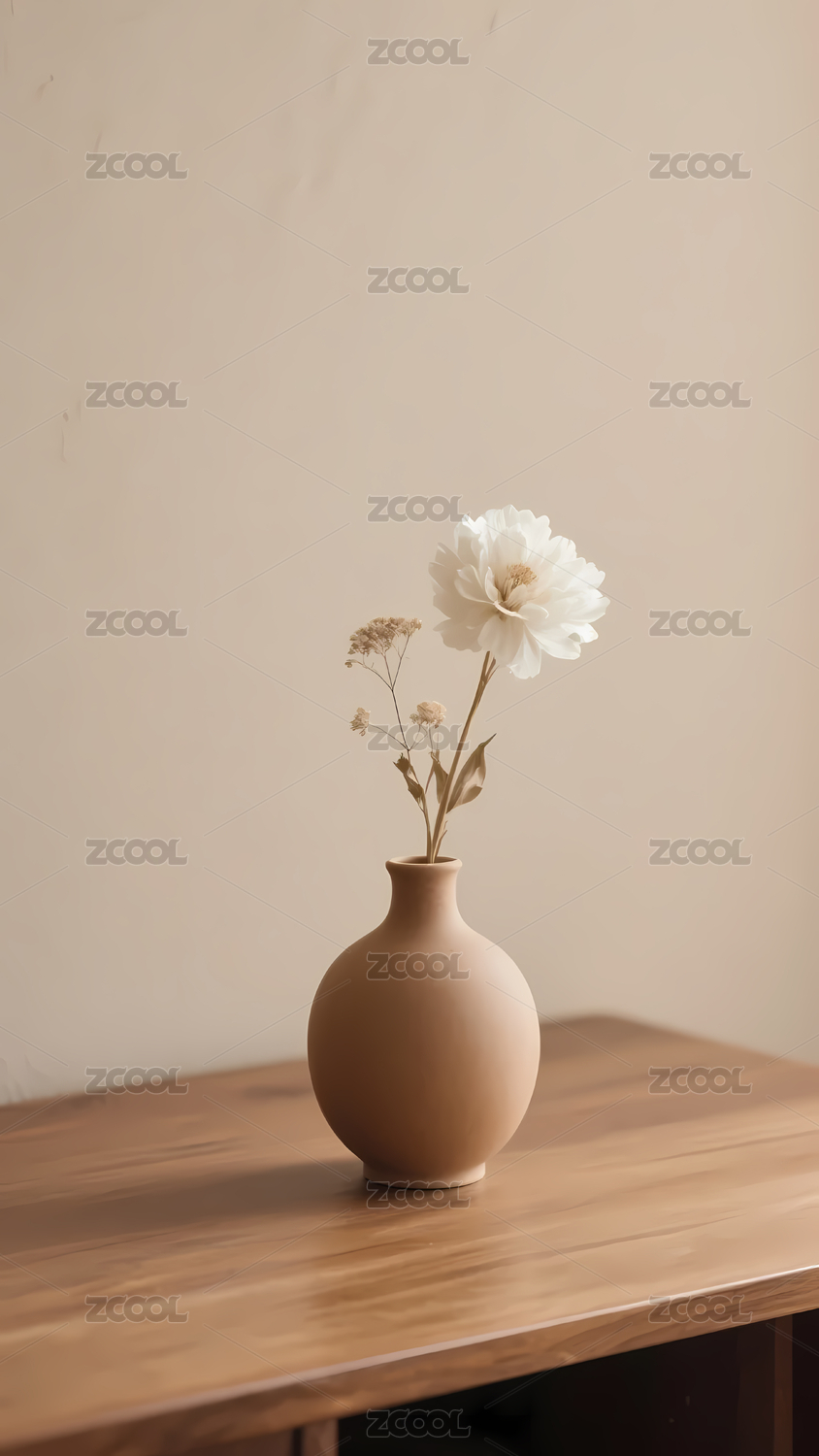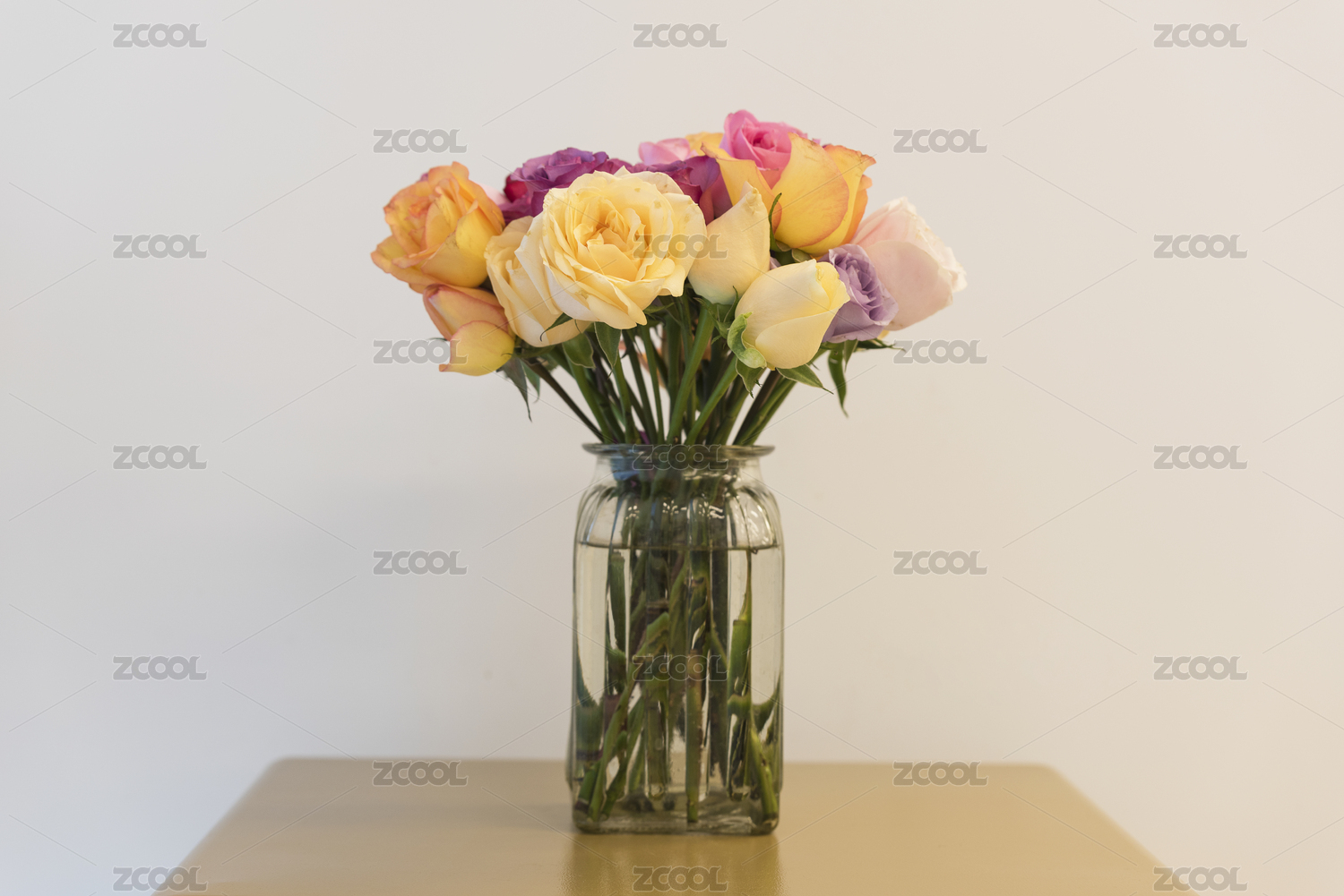在室内,白色桌子上摆放着的鲜花装饰洋牡丹