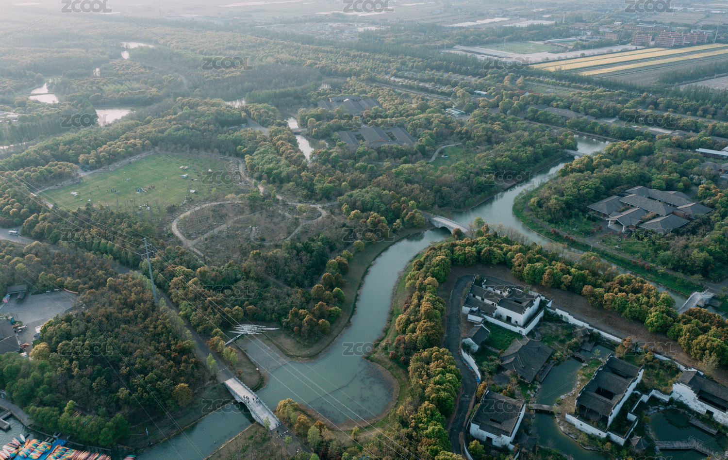 航拍视角,高空,全景,景区,旅游目的地,绿洲,太仓现代农业园,房屋,河流,绿植