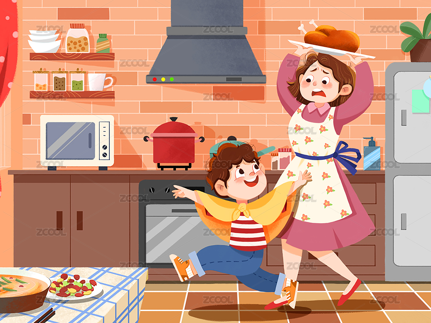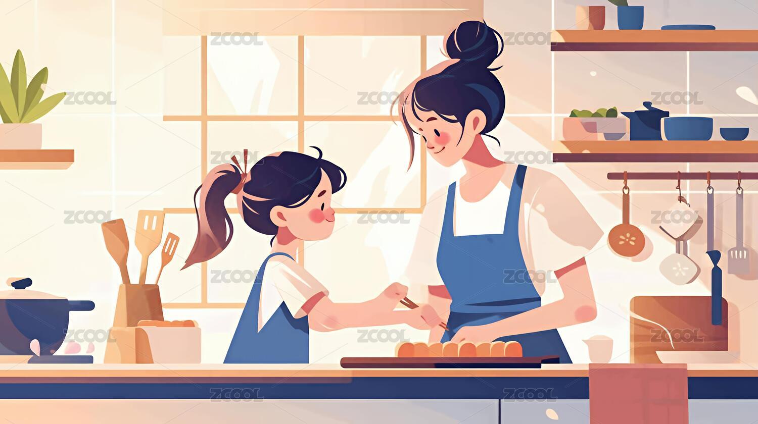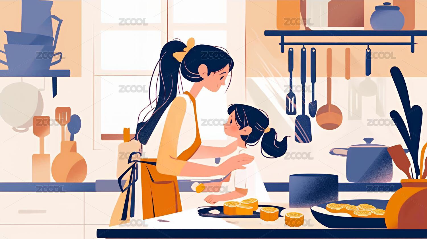 厨房里妈妈给孩子做饭插画