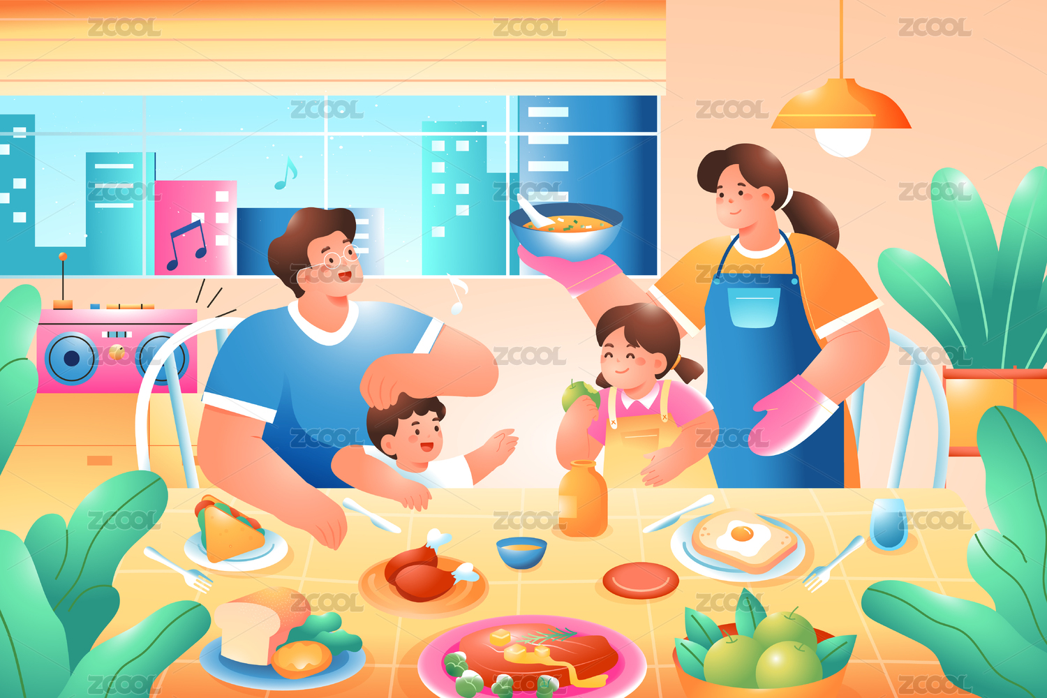 阖家团圆场景插画