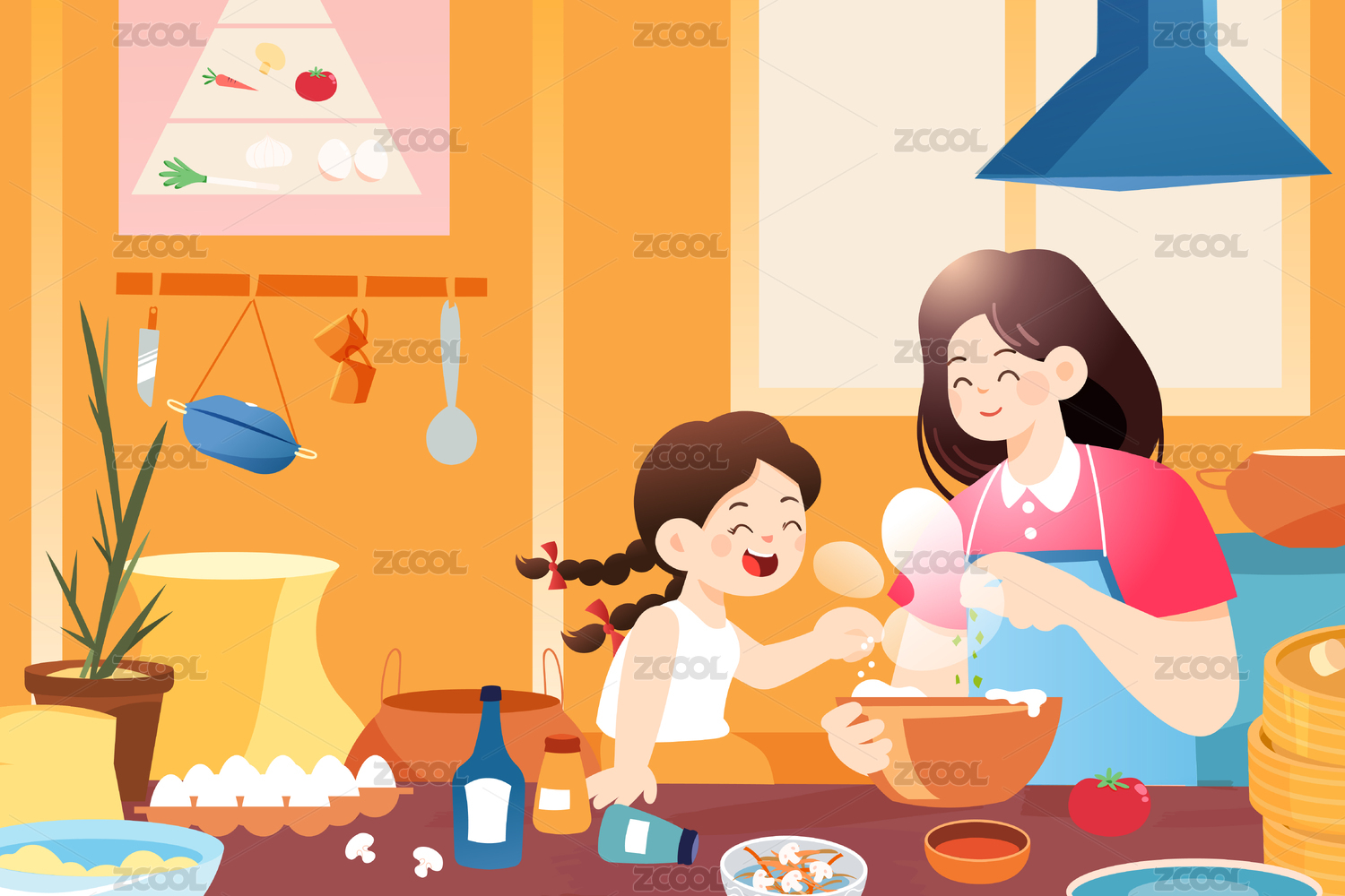 母亲节亲子烹饪矢量插画