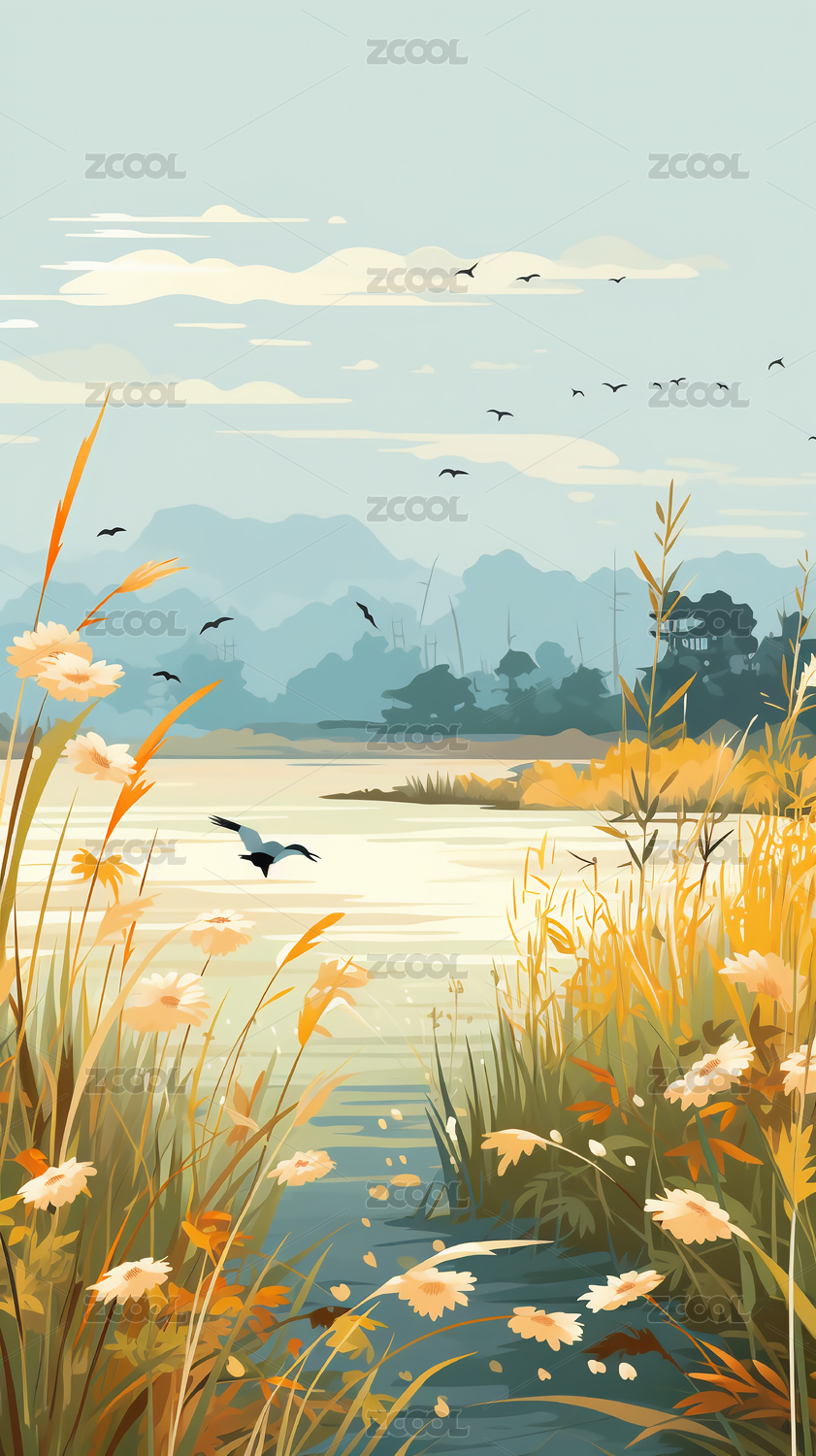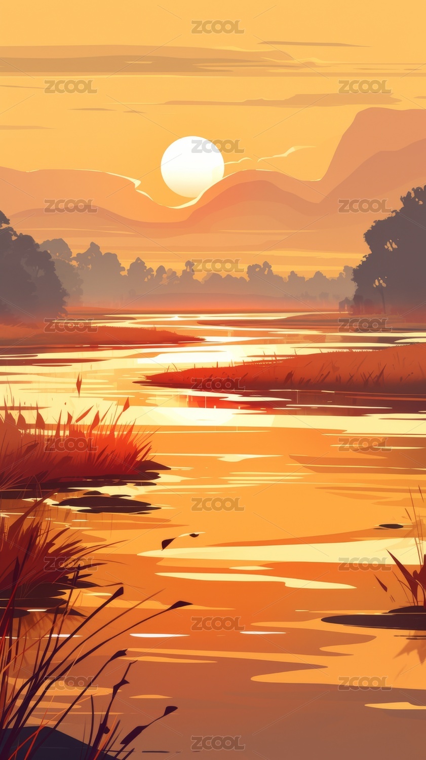 湿地日落秋天景色插画