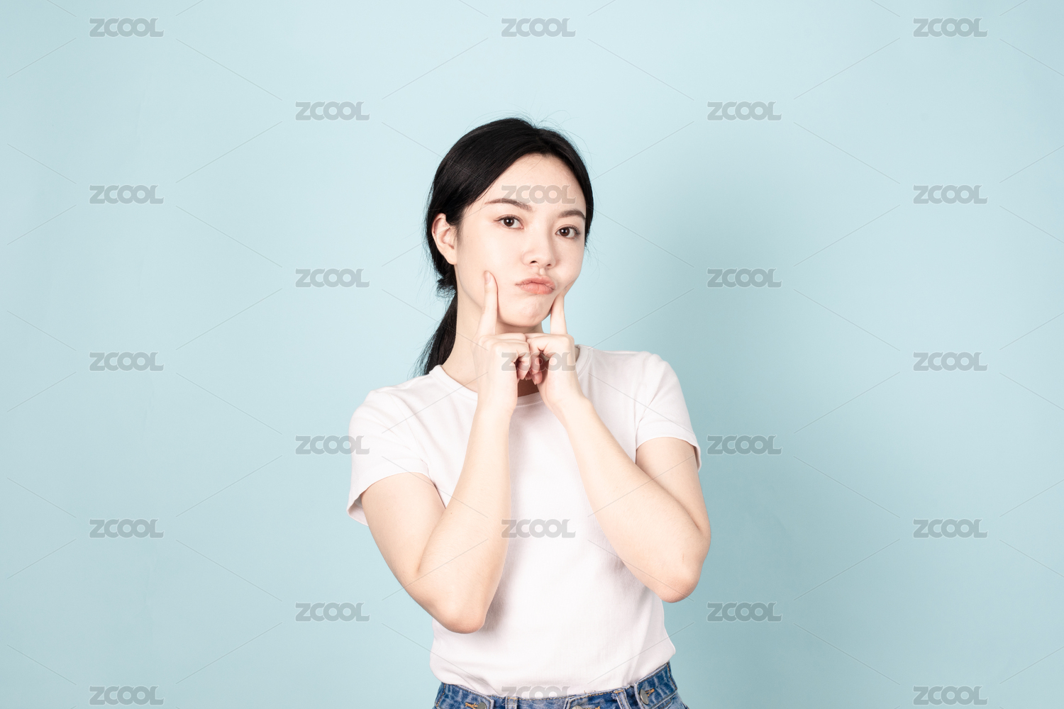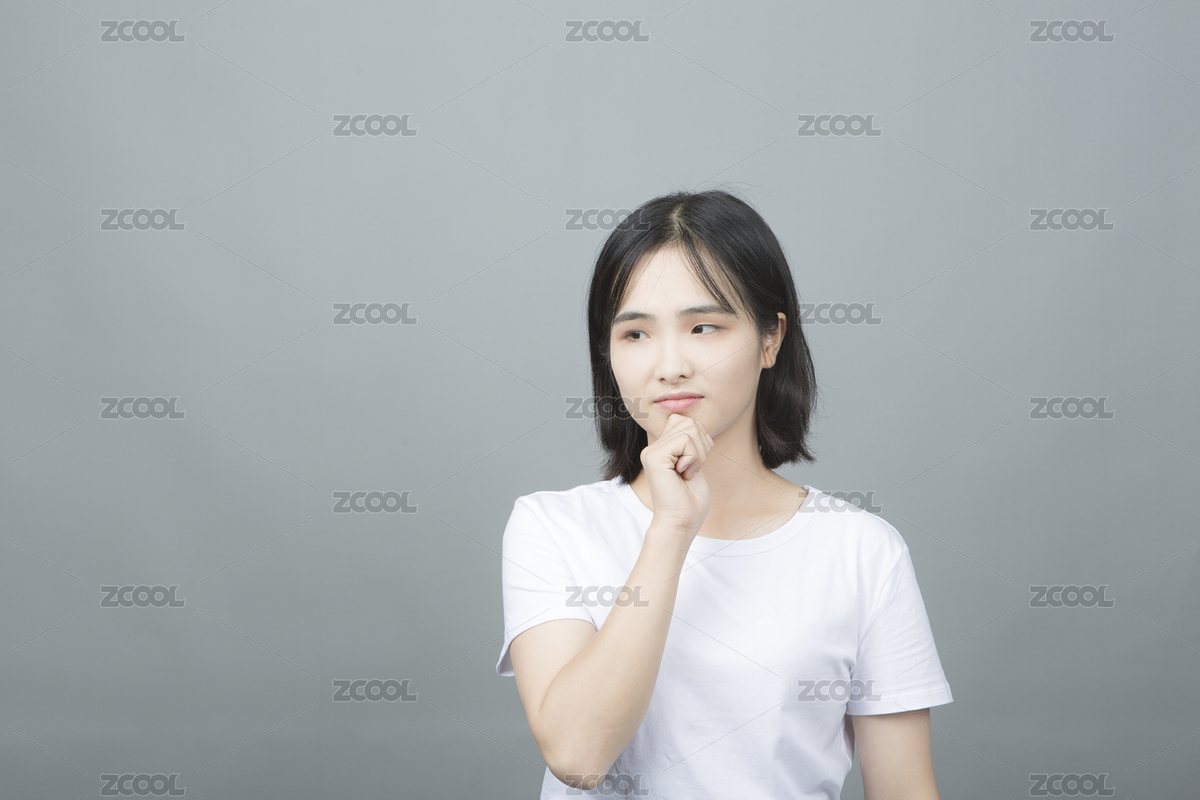 无背景,学生,思考,担心,表情,女生,短发,白T恤,可爱,青春