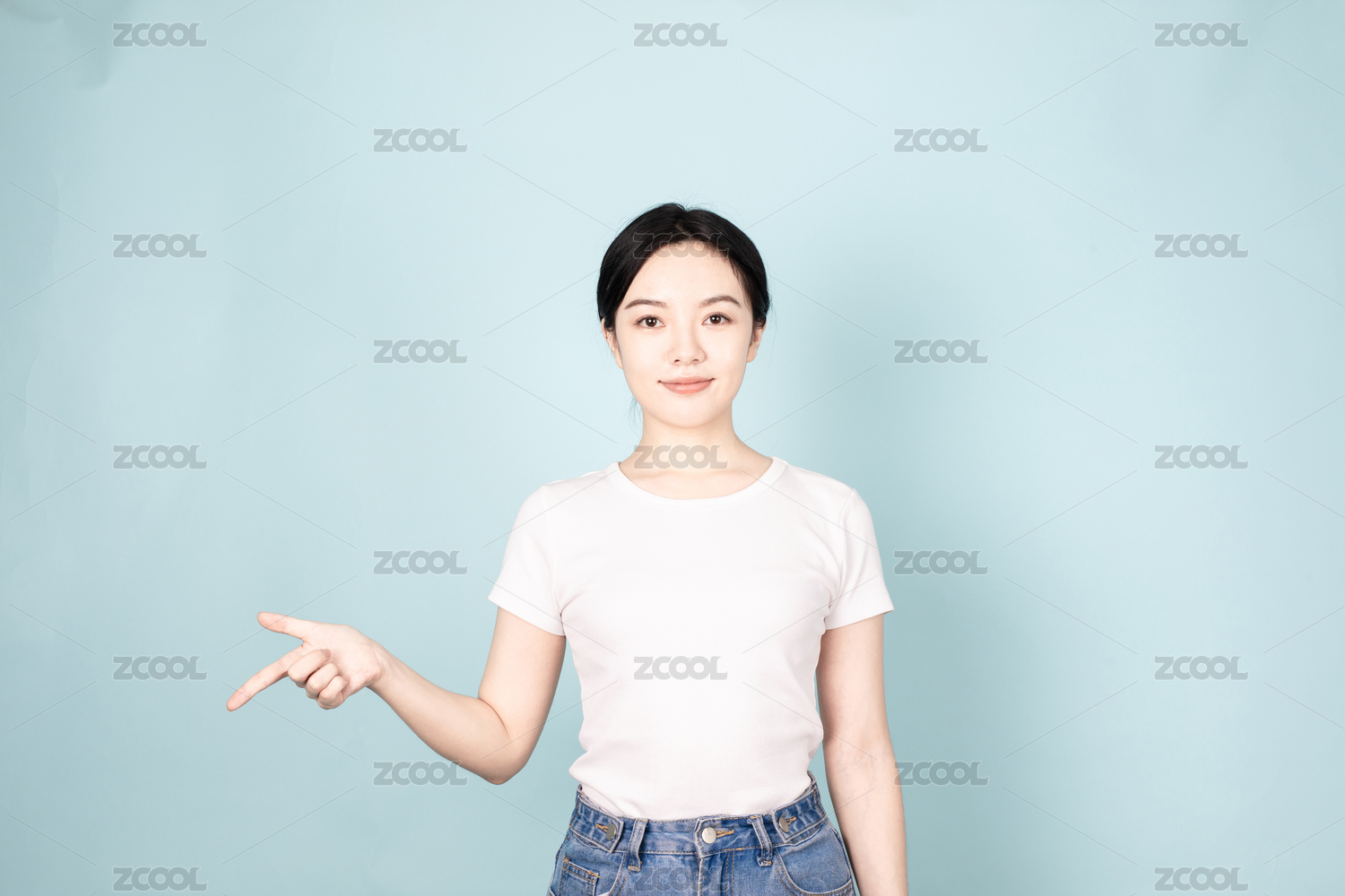 站在蓝色背景前的年轻女生