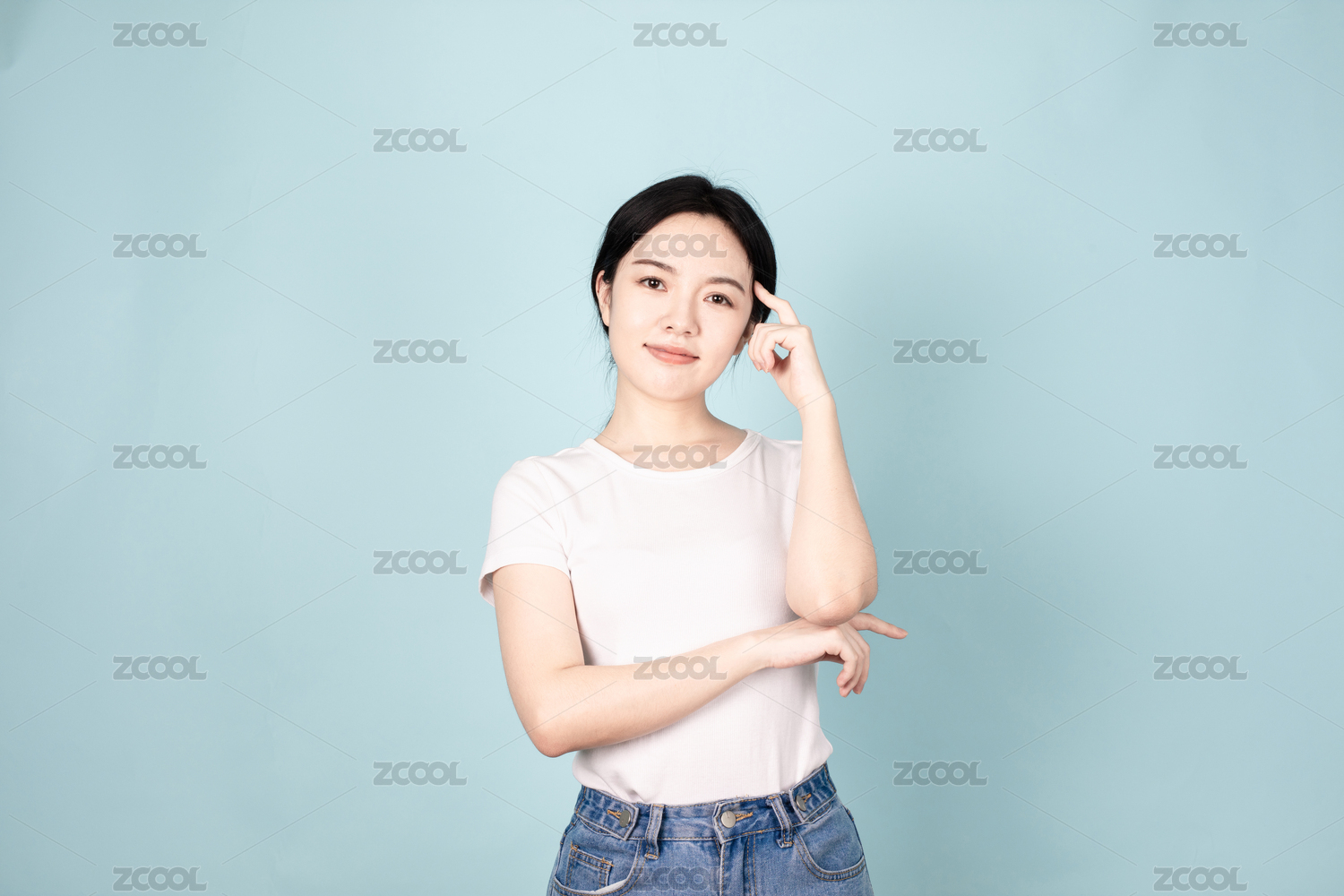 一位美丽的亚裔女孩站在纯色背景墙前用手背轻抚脸颊