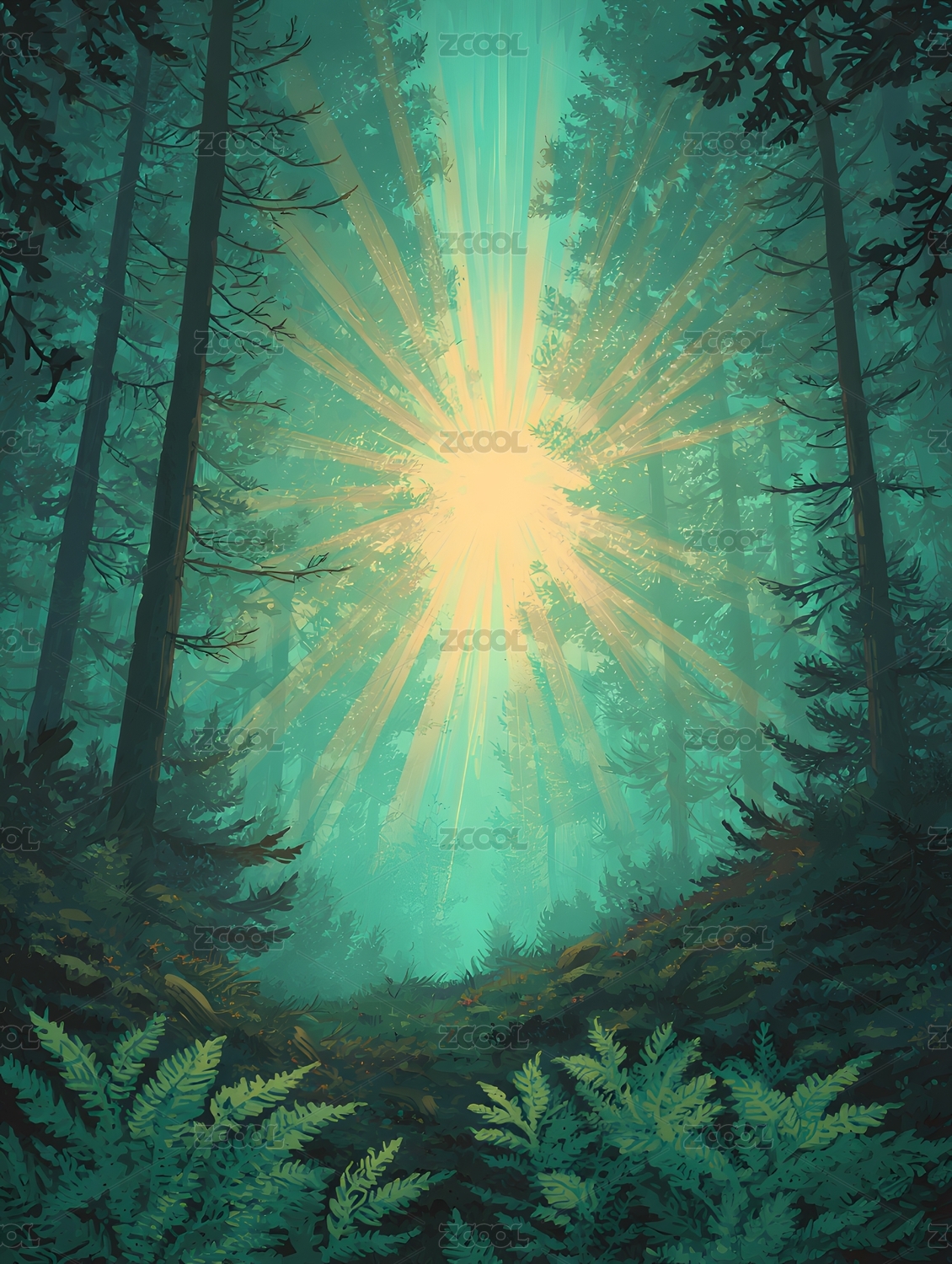 夏天宁静的夜晚,森林里萤火虫闪闪发光插画背景海报