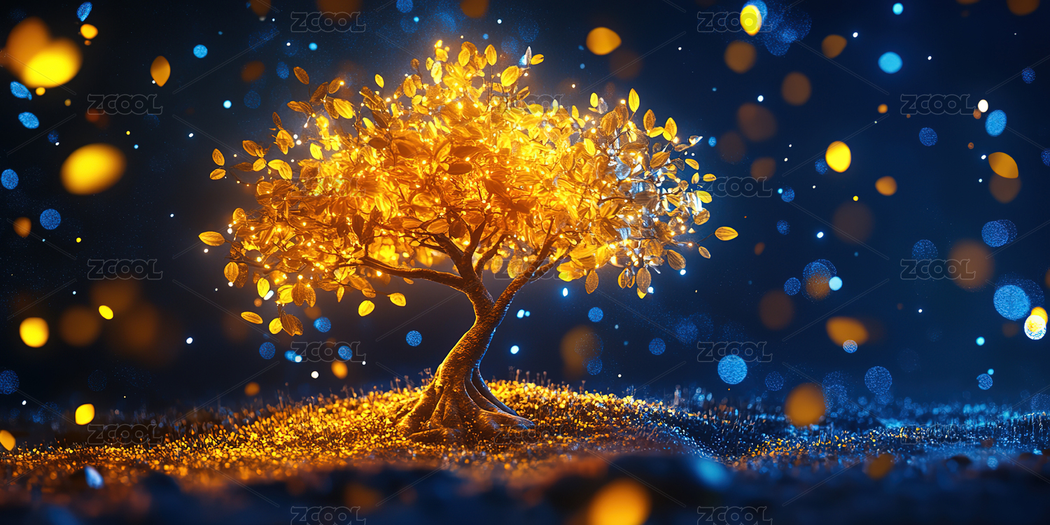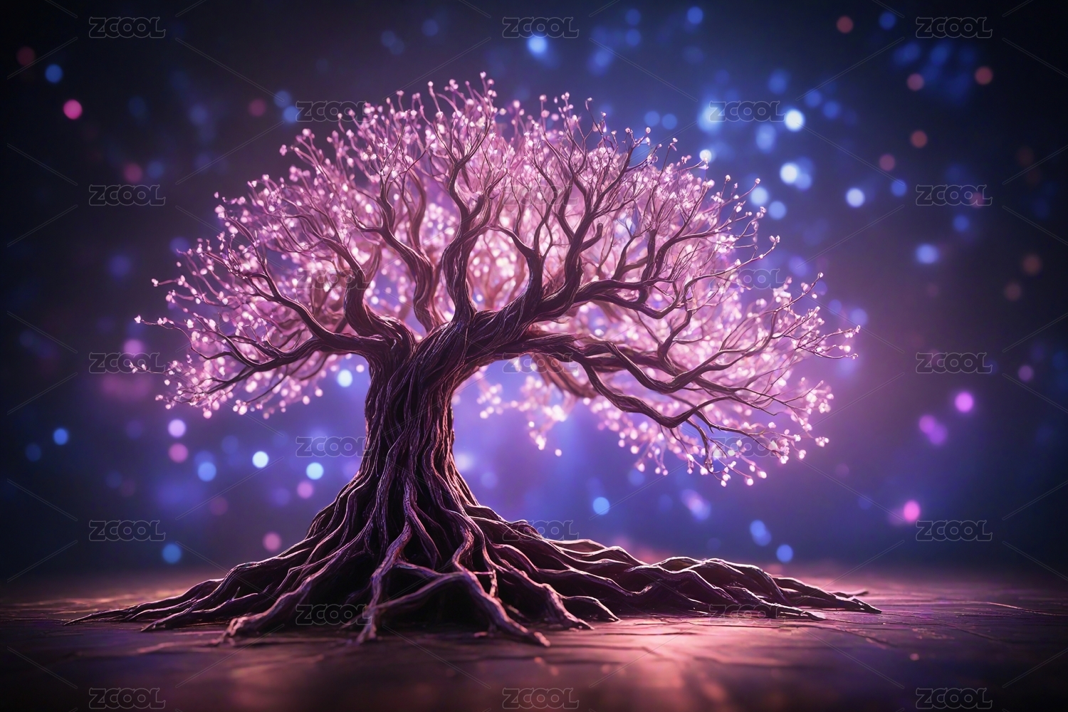 树木,树根,分支,叶子,光斑,闪烁,蓝色背景,梦幻,魔幻,幻想