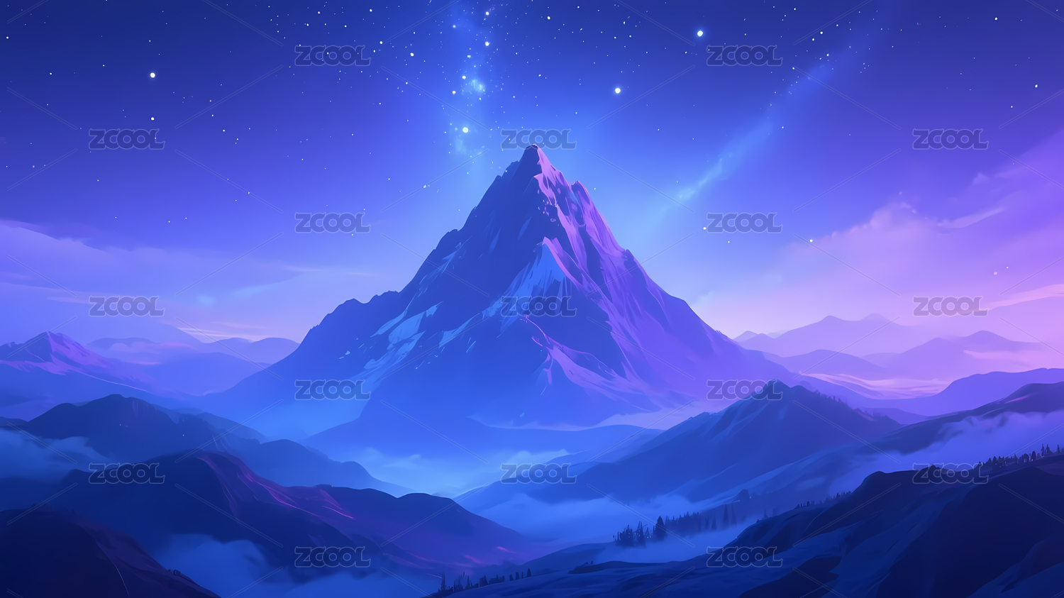 雪山,晨曦,云雾,山峰,天空,星星,树木,草地,光线,道路