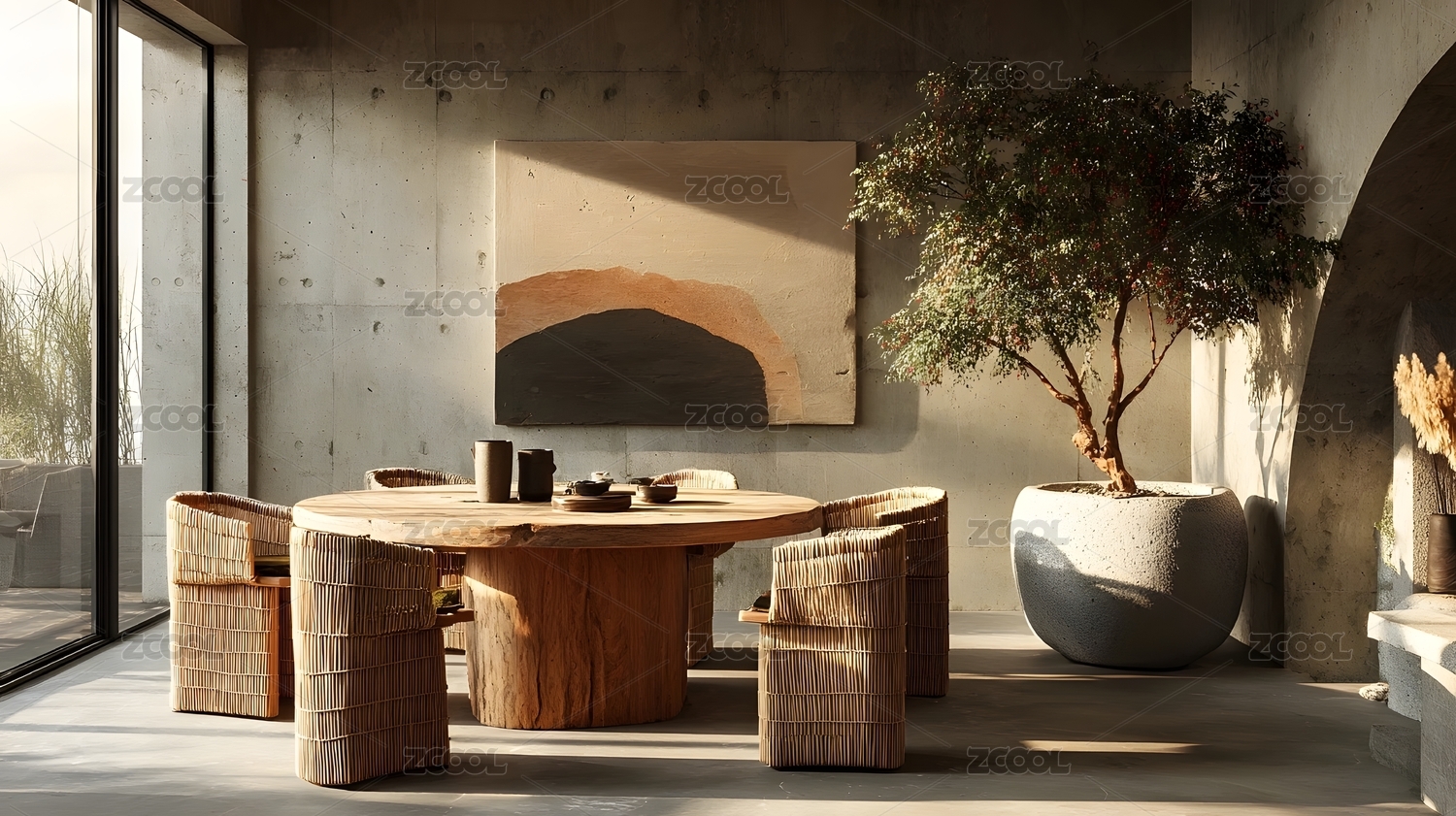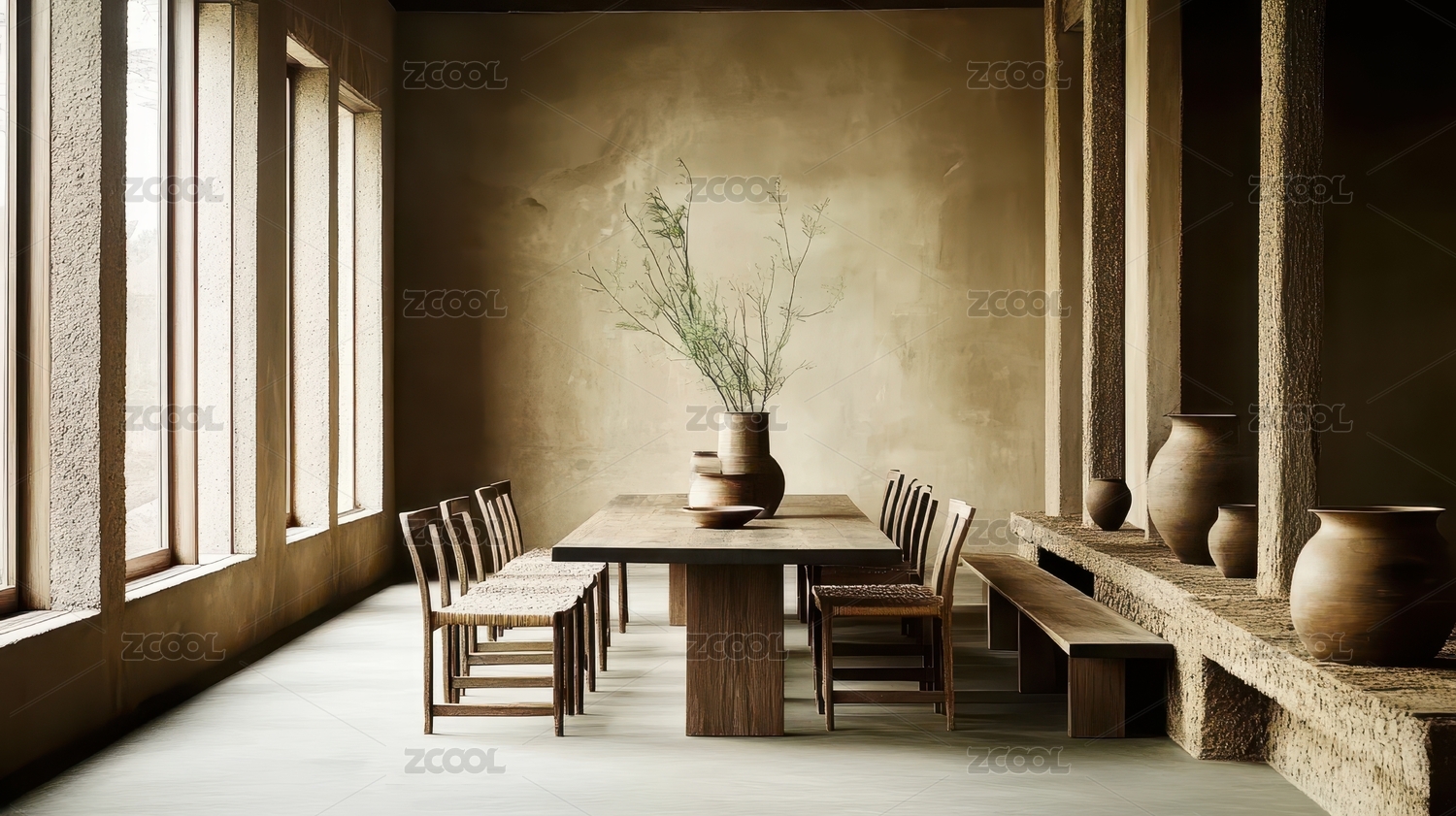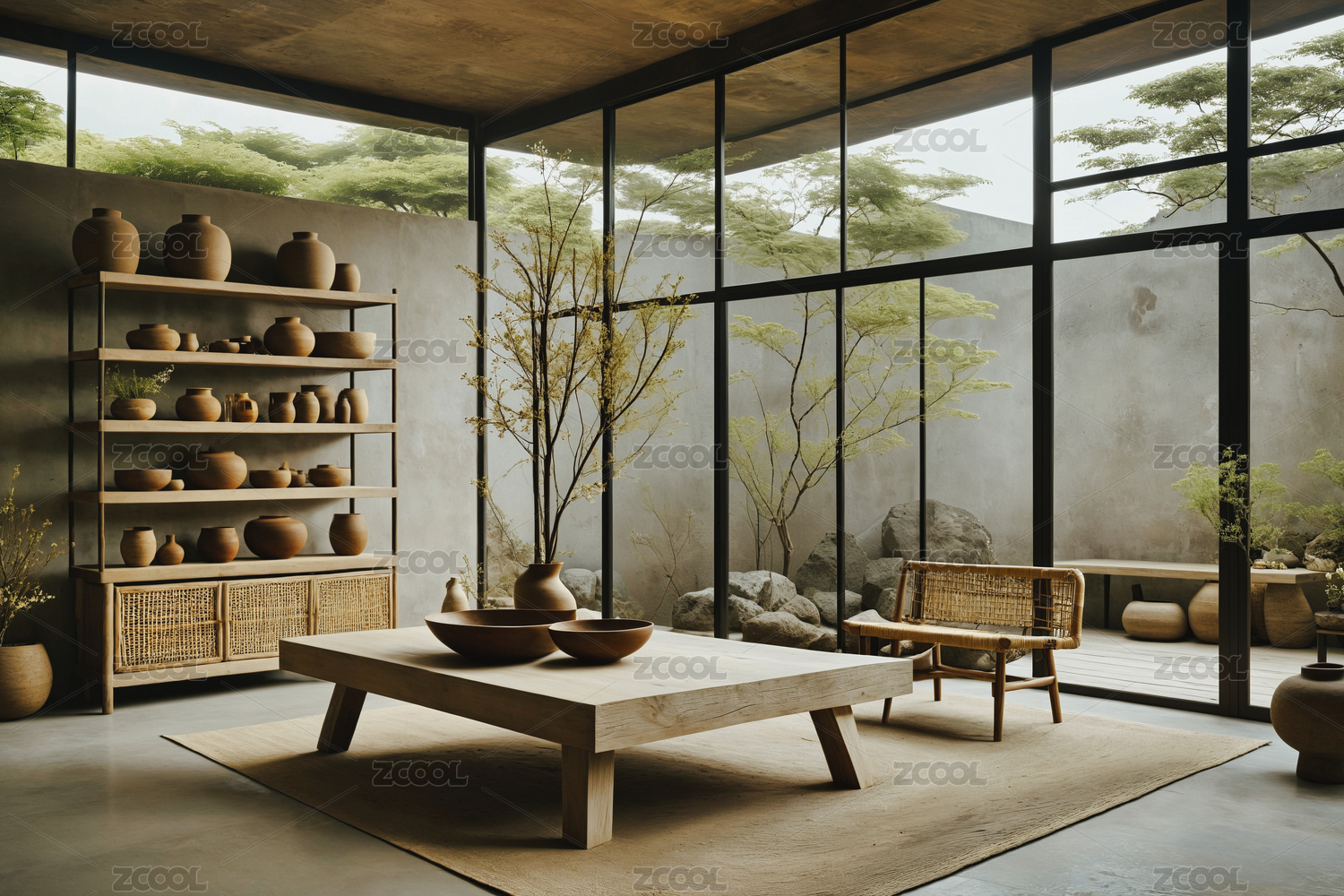 侘寂,室内,沙发,桌子,花瓶,花卉,窗户,光线,墙壁,地毯