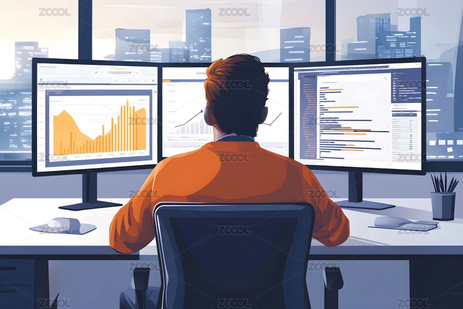 办公桌前专注工作的背影