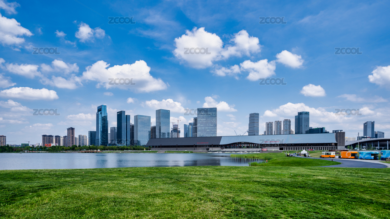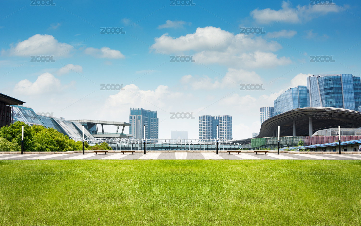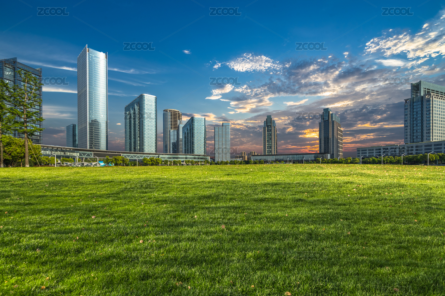 成都天府公园的草坪与写字楼建筑
