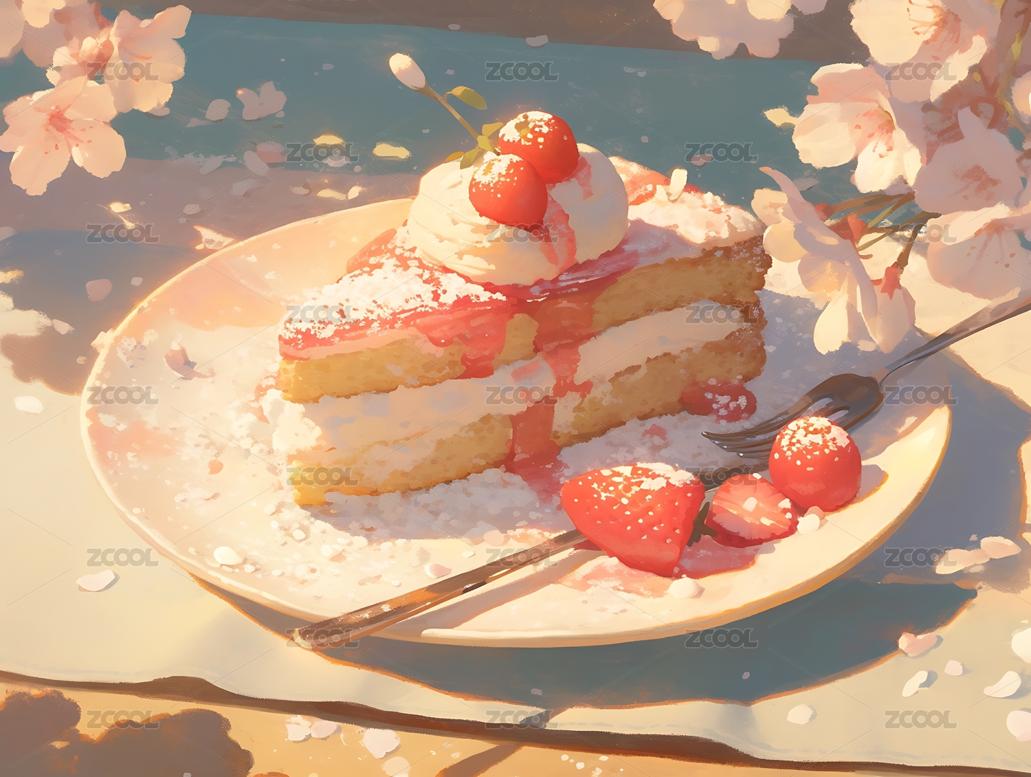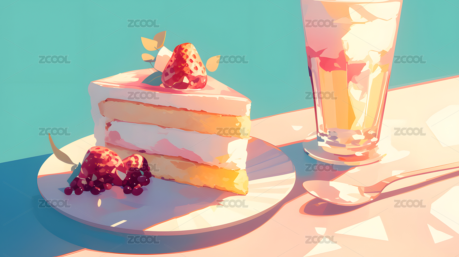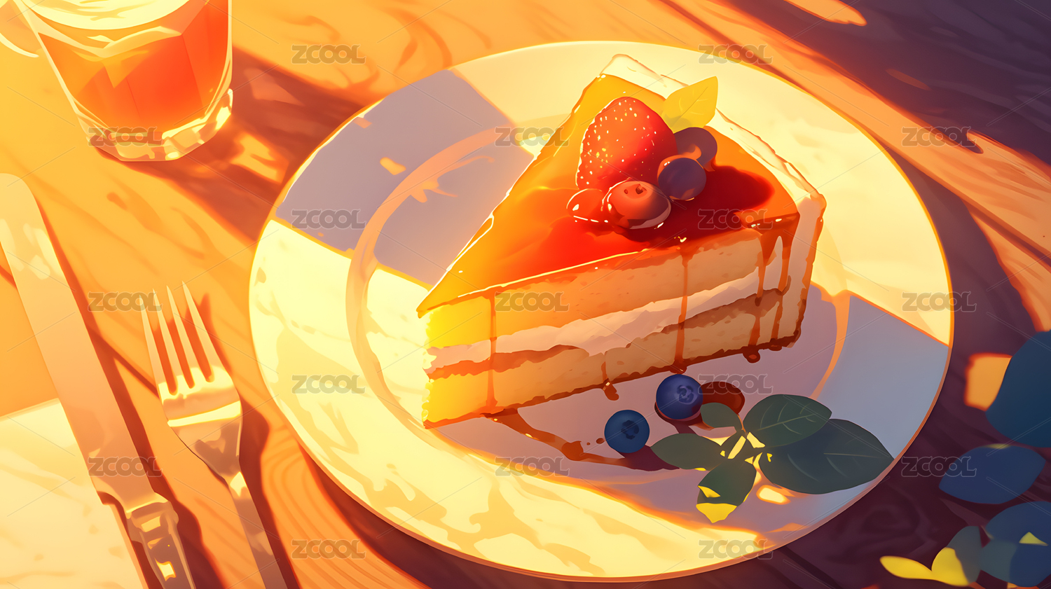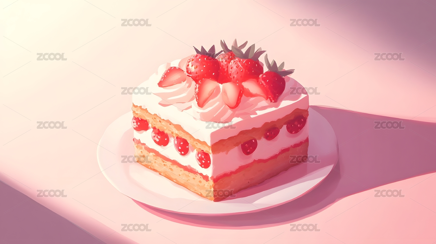 盘子上切开的水果奶油蛋糕3D卡通食品插画