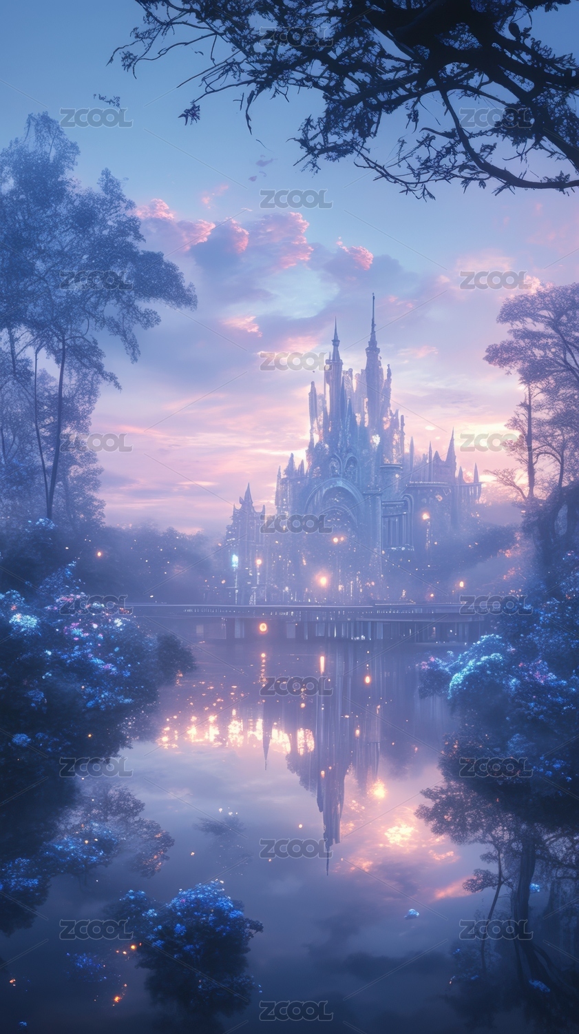 梦幻城堡湖畔晨景