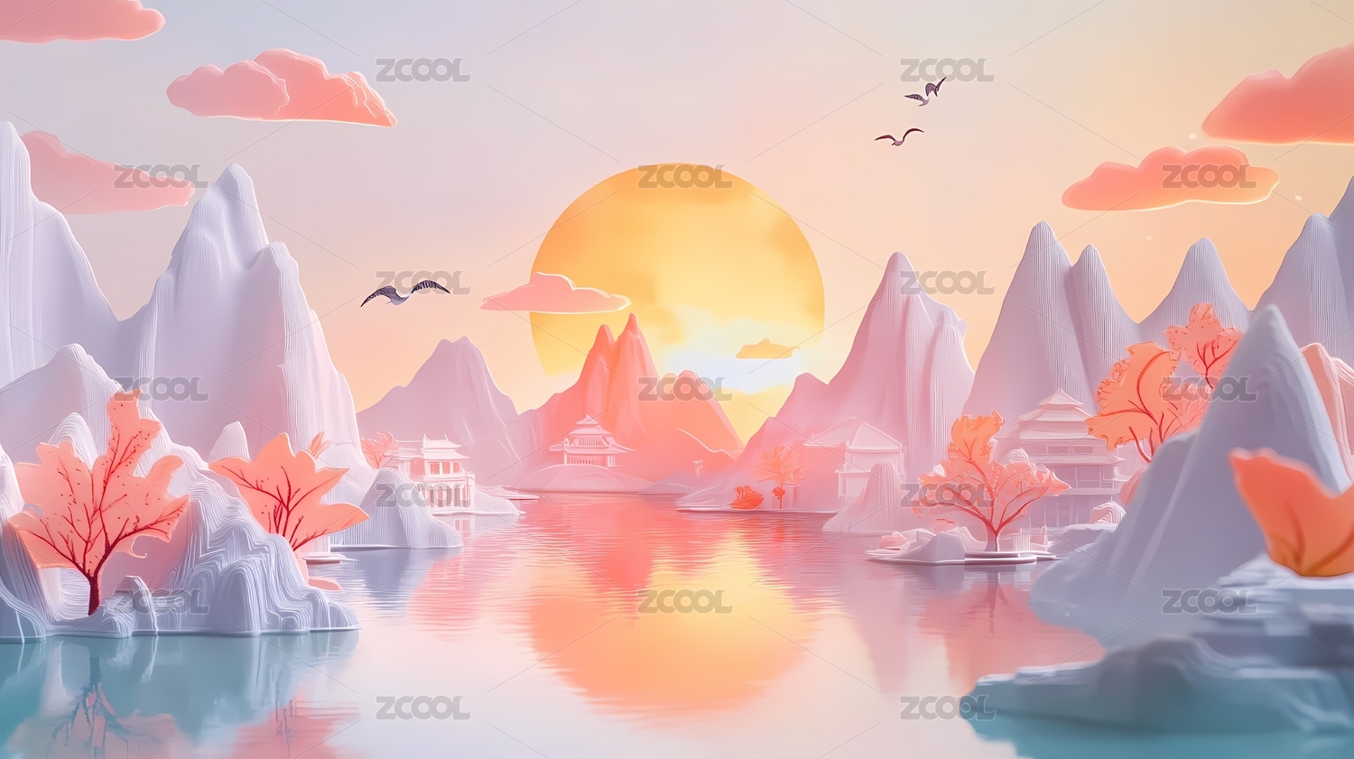 日出湖水群山国潮风3D风光