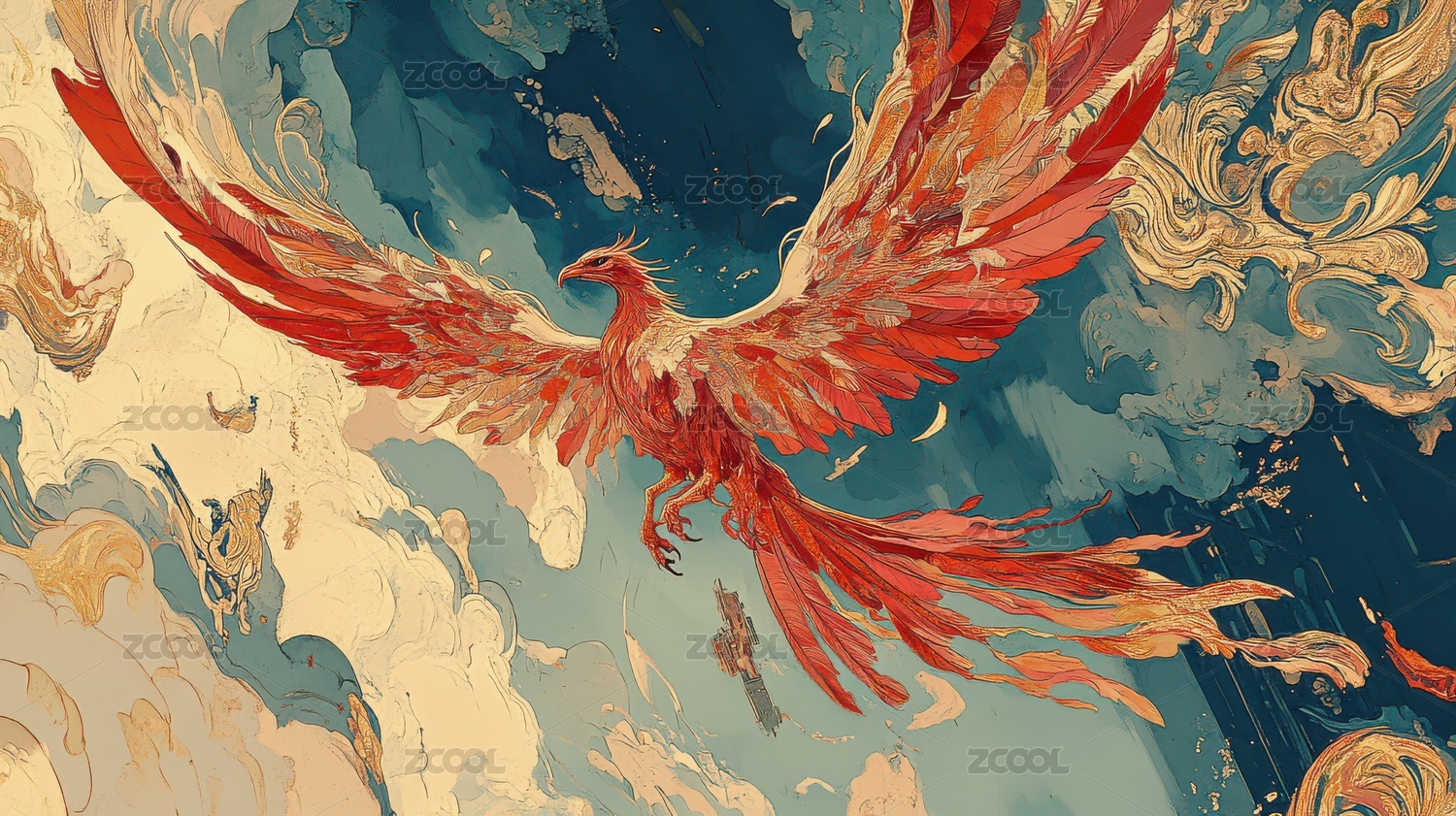 凤凰,神鸟,神兽,插画,水彩画,绘画,抽象,神话传说,彩色,神话