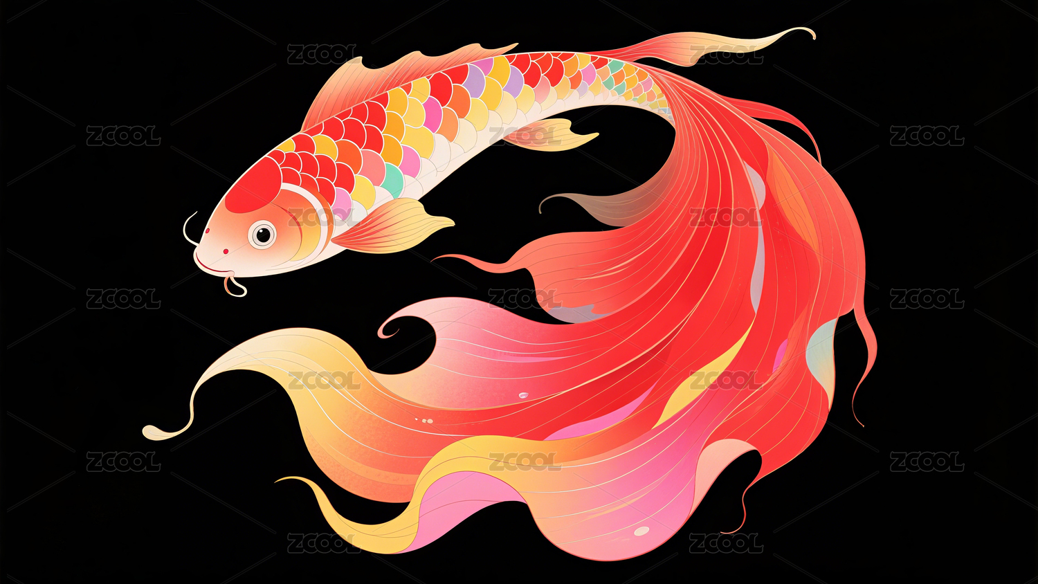 国潮风,中国风,浮世绘,色彩艳丽,飞翔,飞鱼,鱼翔浅底,彩色插画,好运,锦鲤