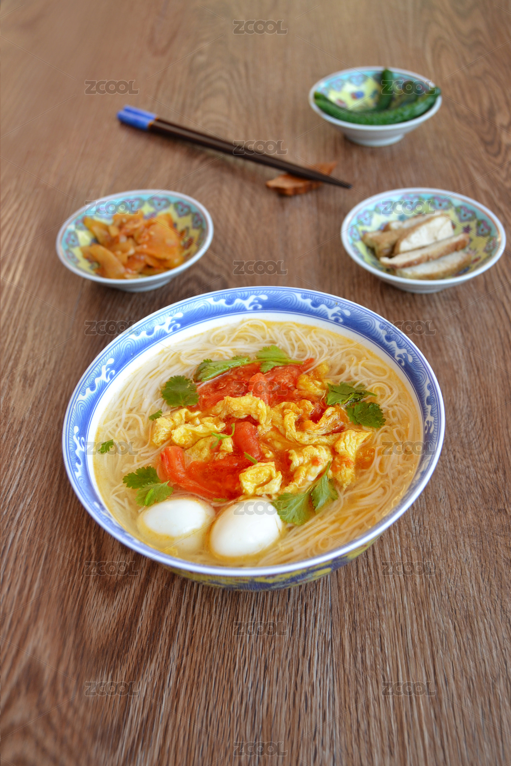 木质桌面上的西红柿鸡蛋面加配菜