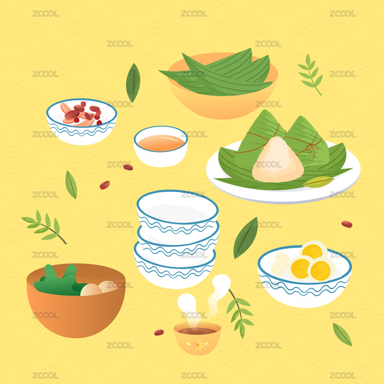 端午节包粽子和糯米红枣红豆鸭蛋插画矢量图