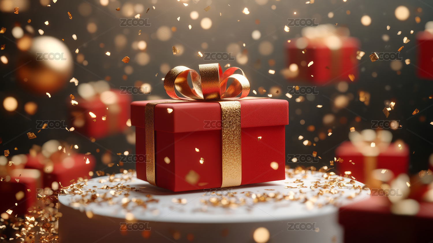 3D渲染红色圣诞装饰礼盒丝带闪耀背景