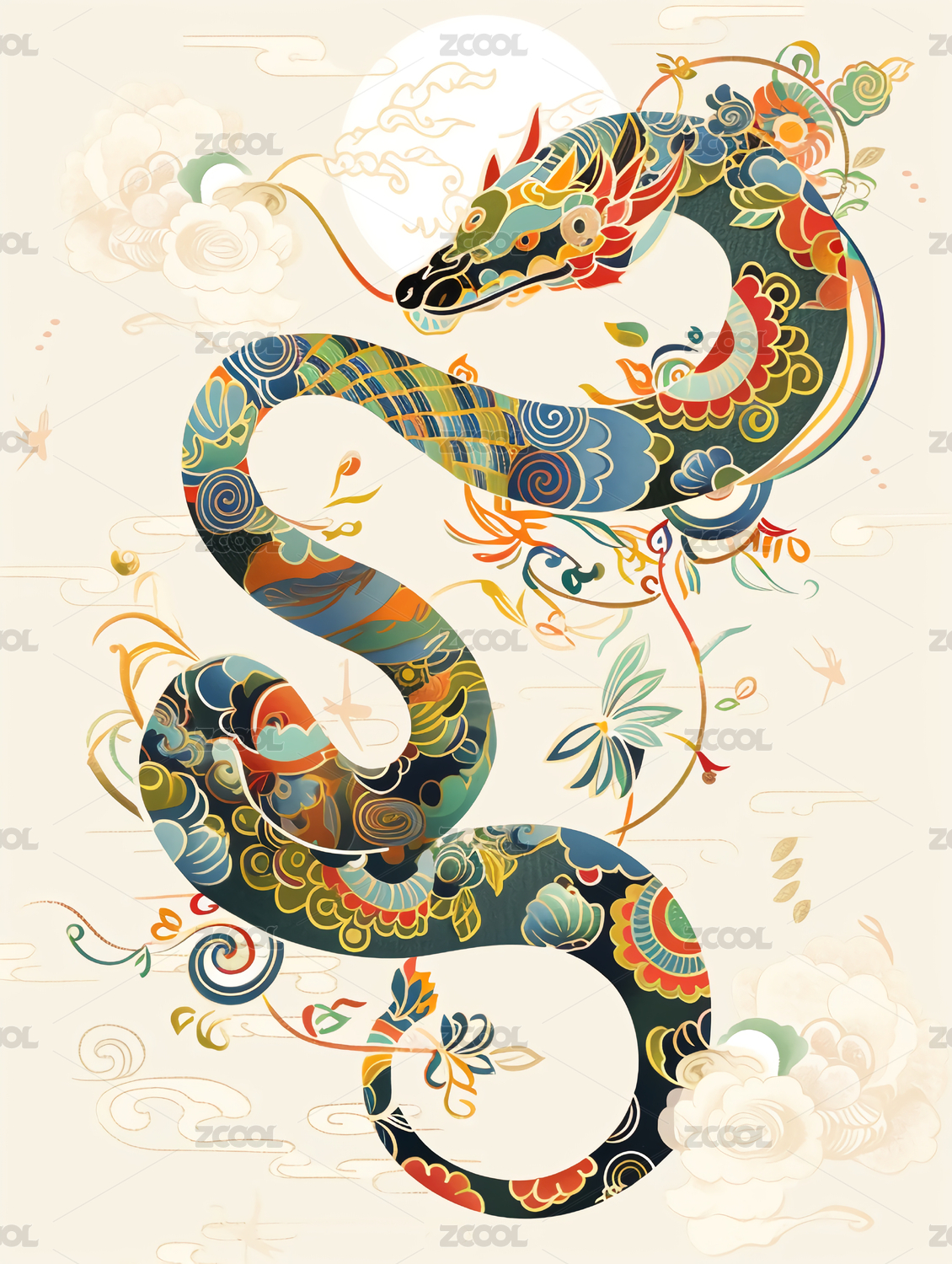 喜庆的复古风格五彩斑斓的蛇和花朵