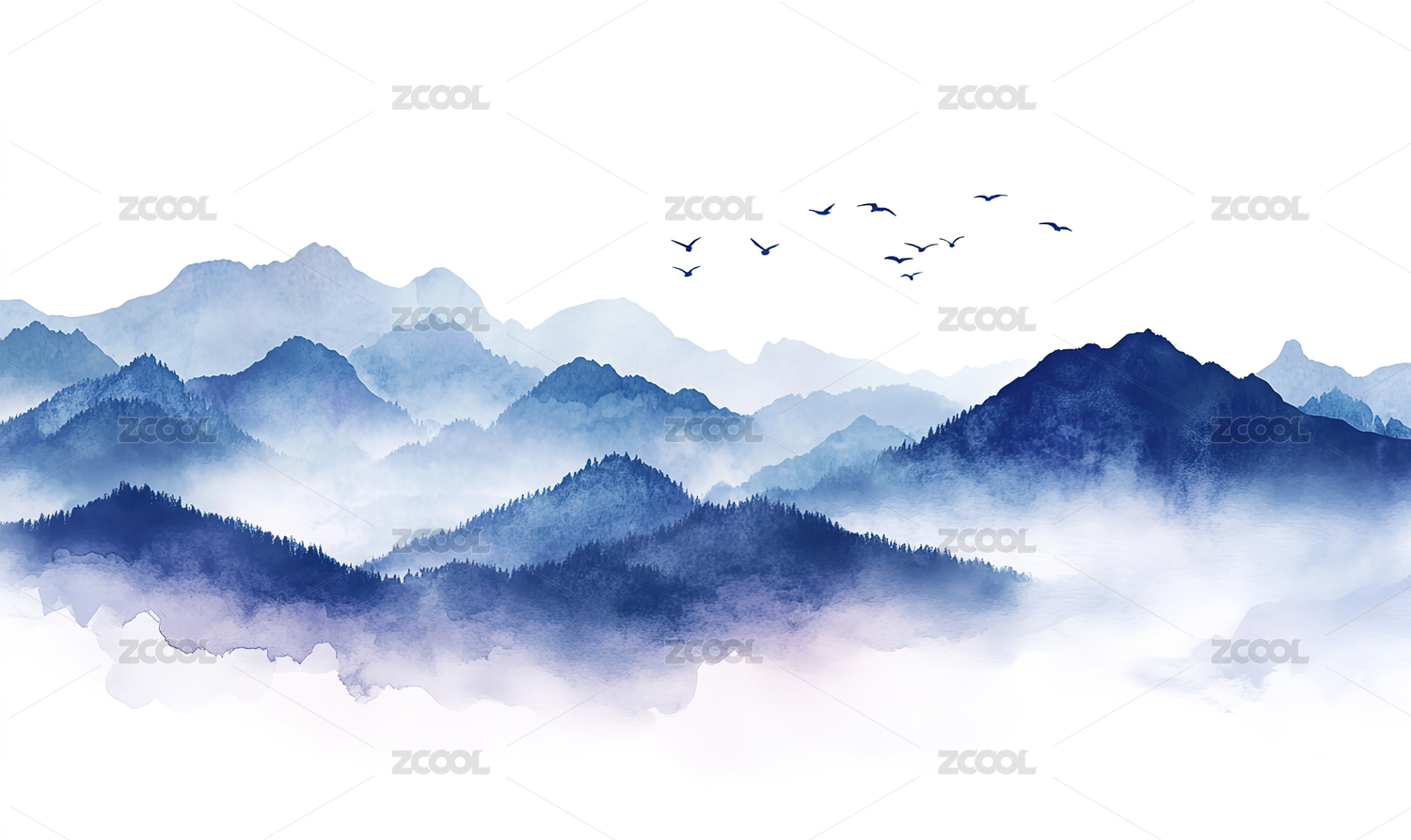 插画,山水,山水画,水墨画,山脉,风景,鸟类,装饰画,新中式风格,国风