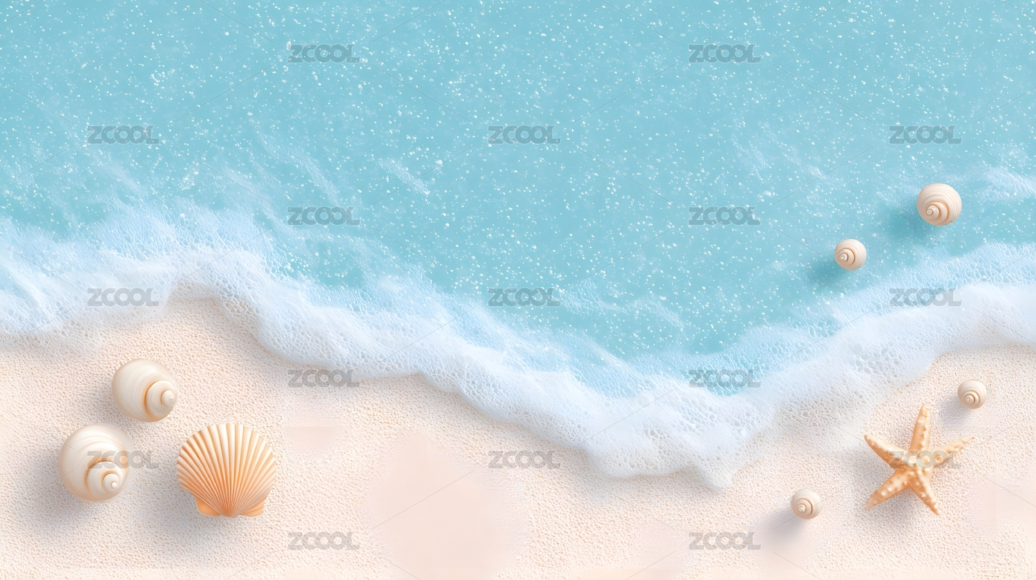 俯视海边海浪冲上有海星贝壳的手绘水彩插画