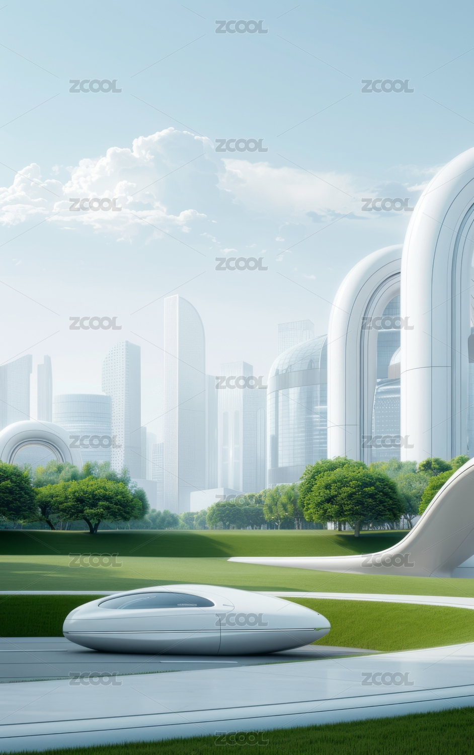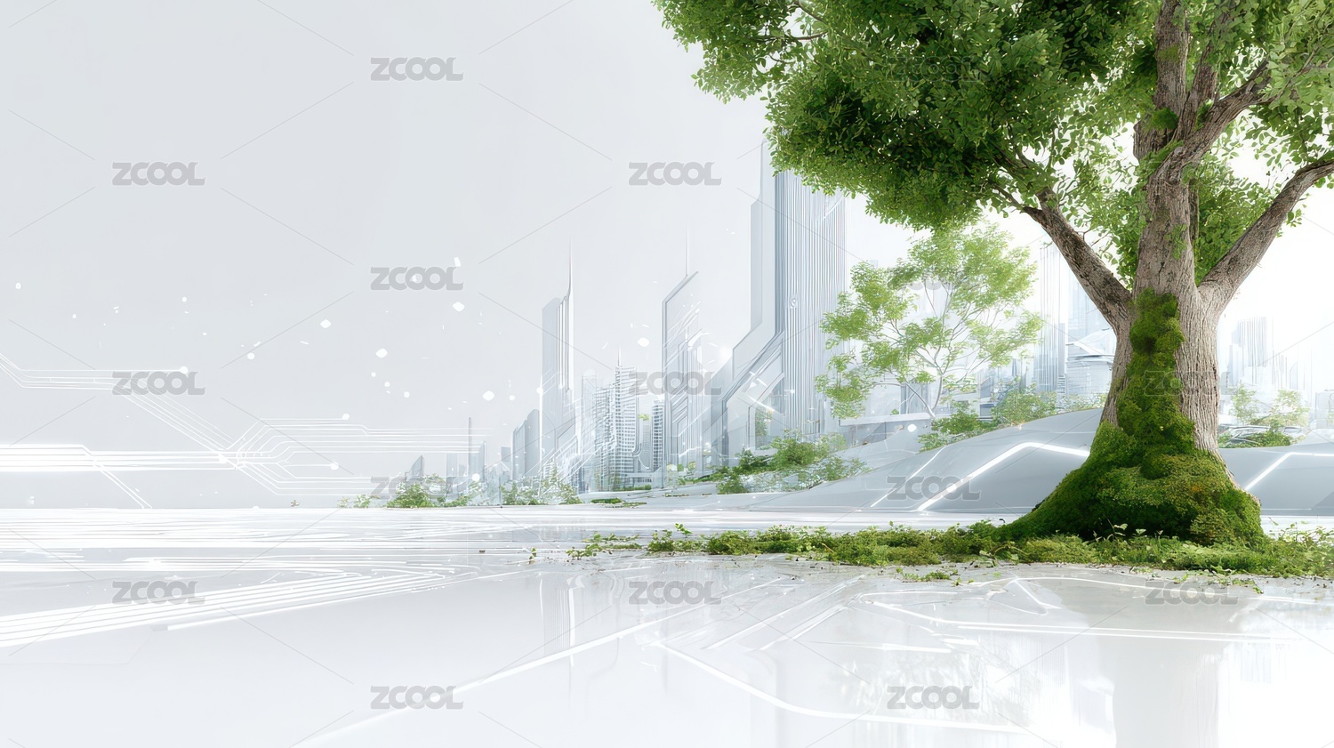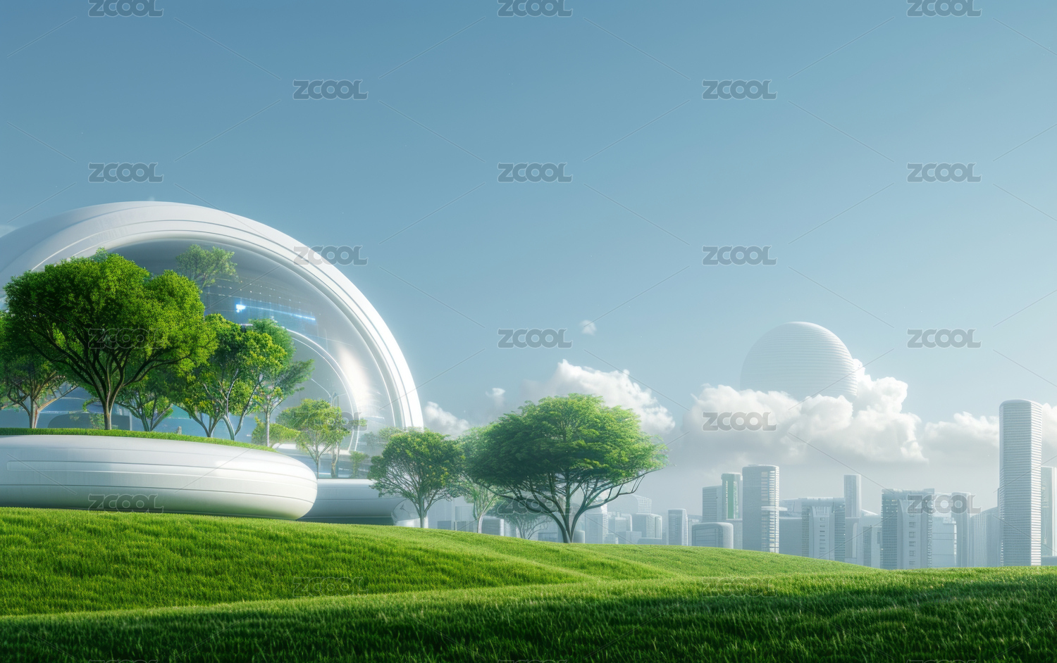 科技城市绿色生态办公玻璃幕墙建筑3D插画