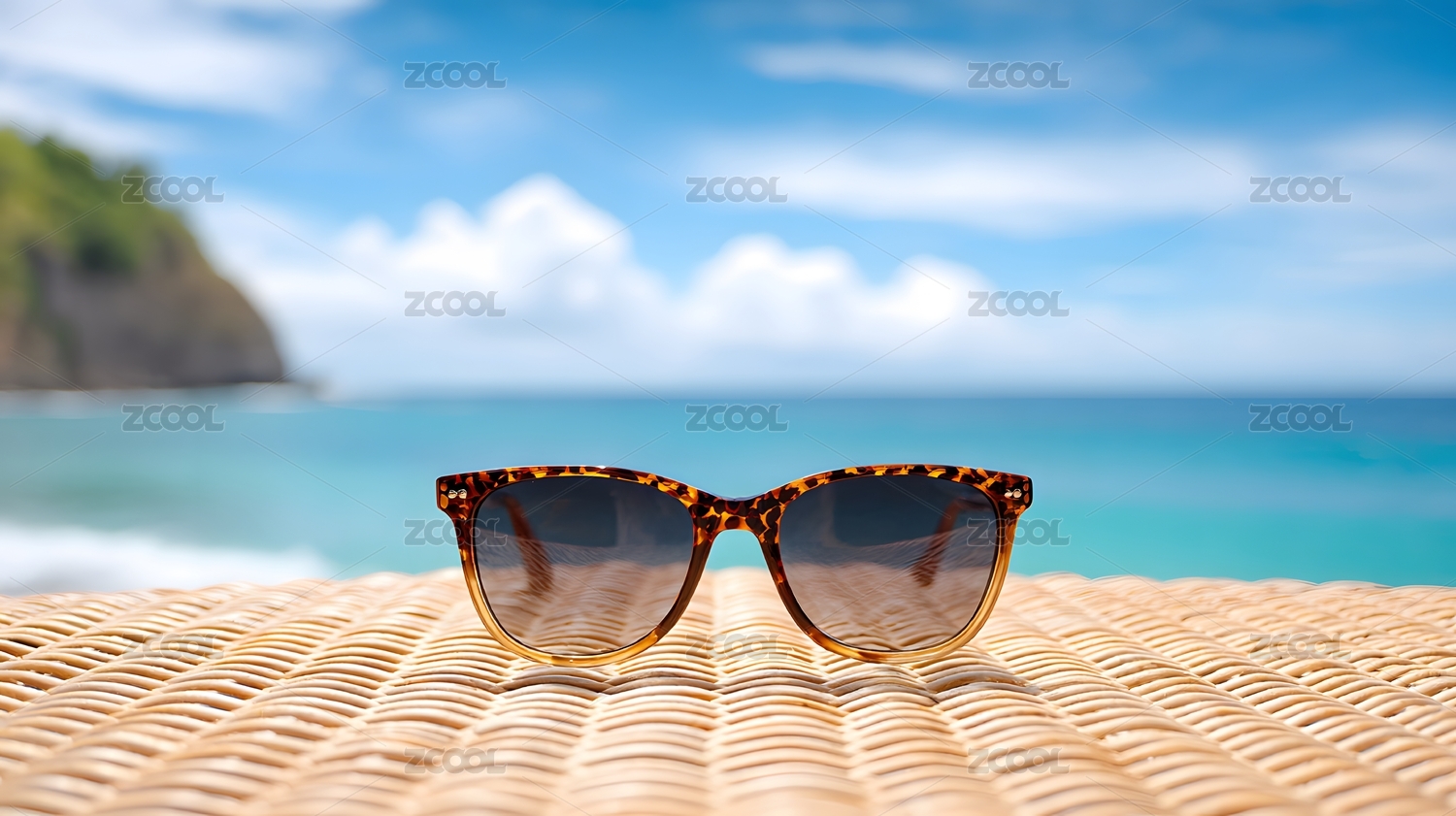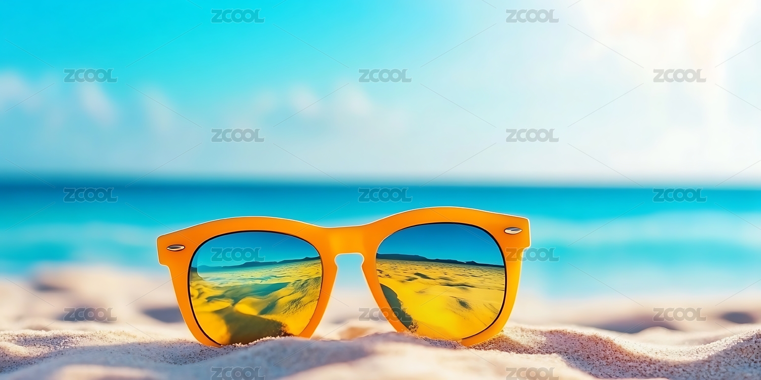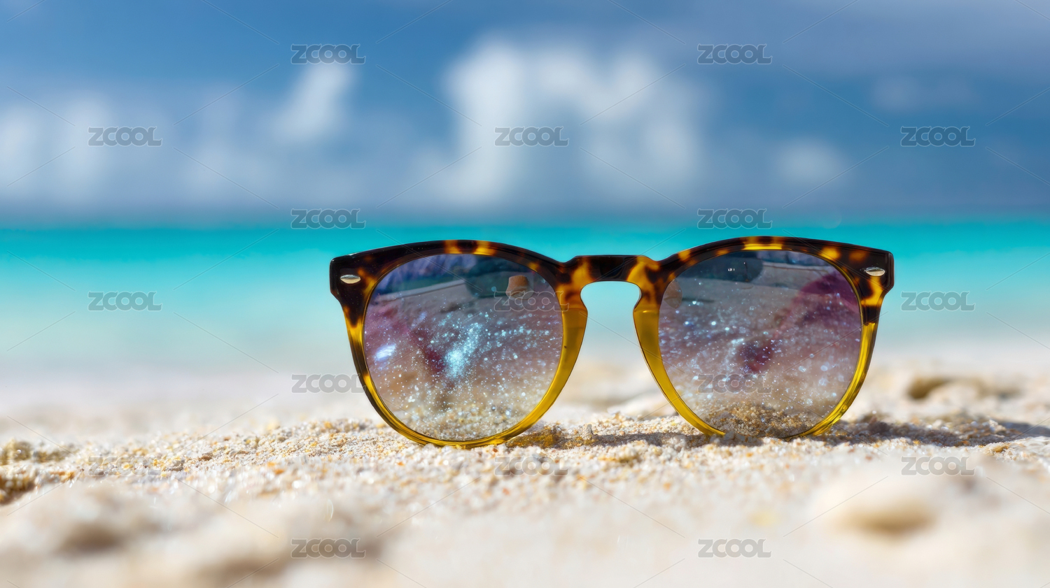 阳光照耀下的海岸沙滩上的太阳眼镜