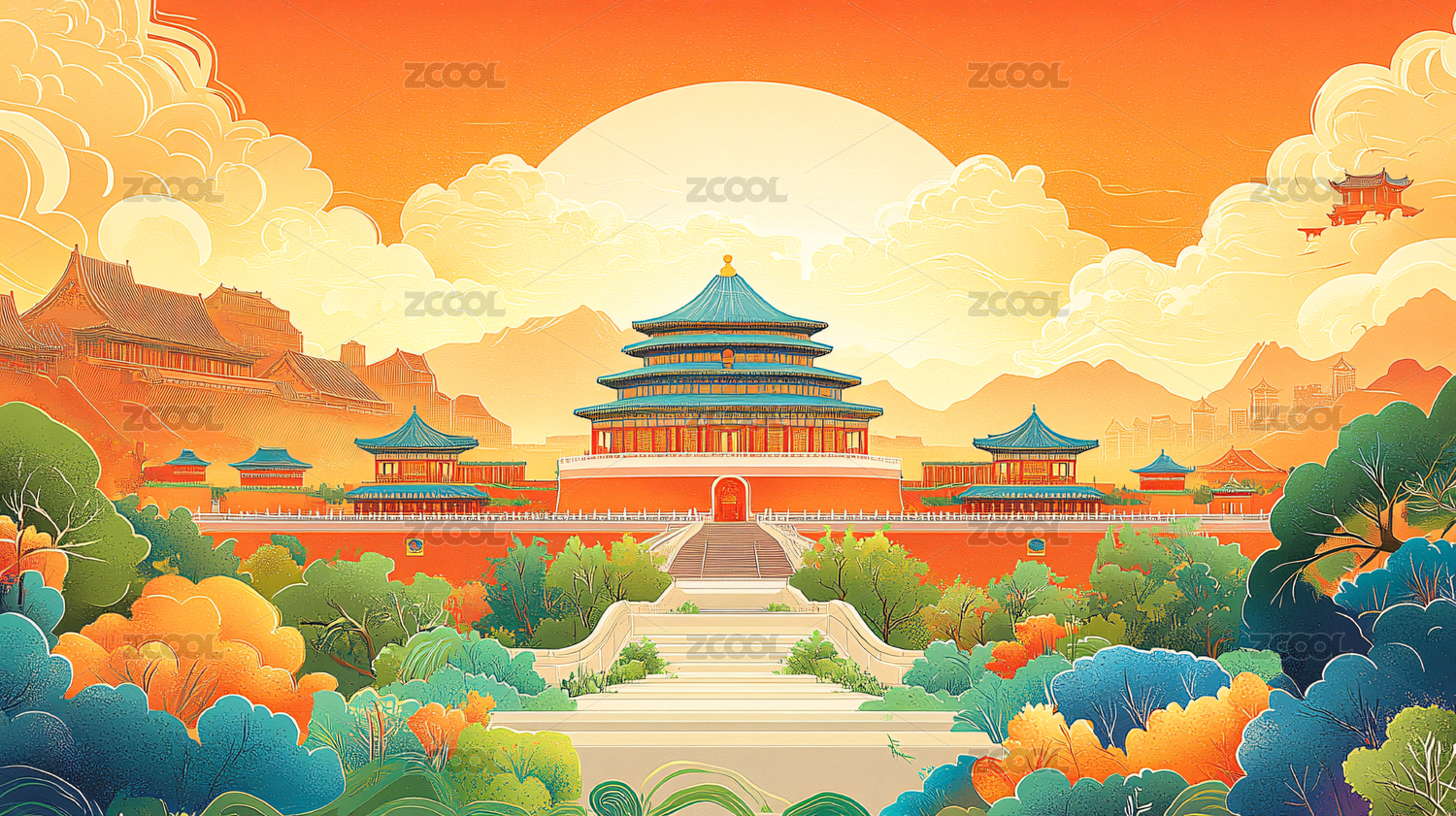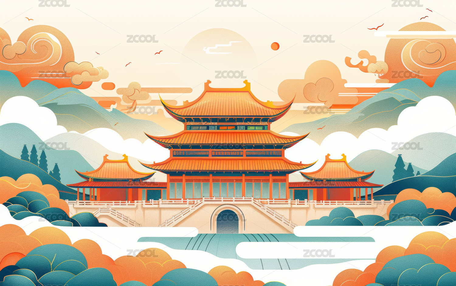 国潮风格中式古代建筑宫殿仙鹤飞远山祥云