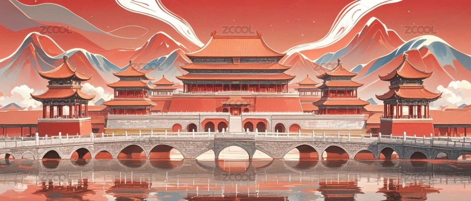 中国古典宫殿水墨画,红墙黄瓦映照水面