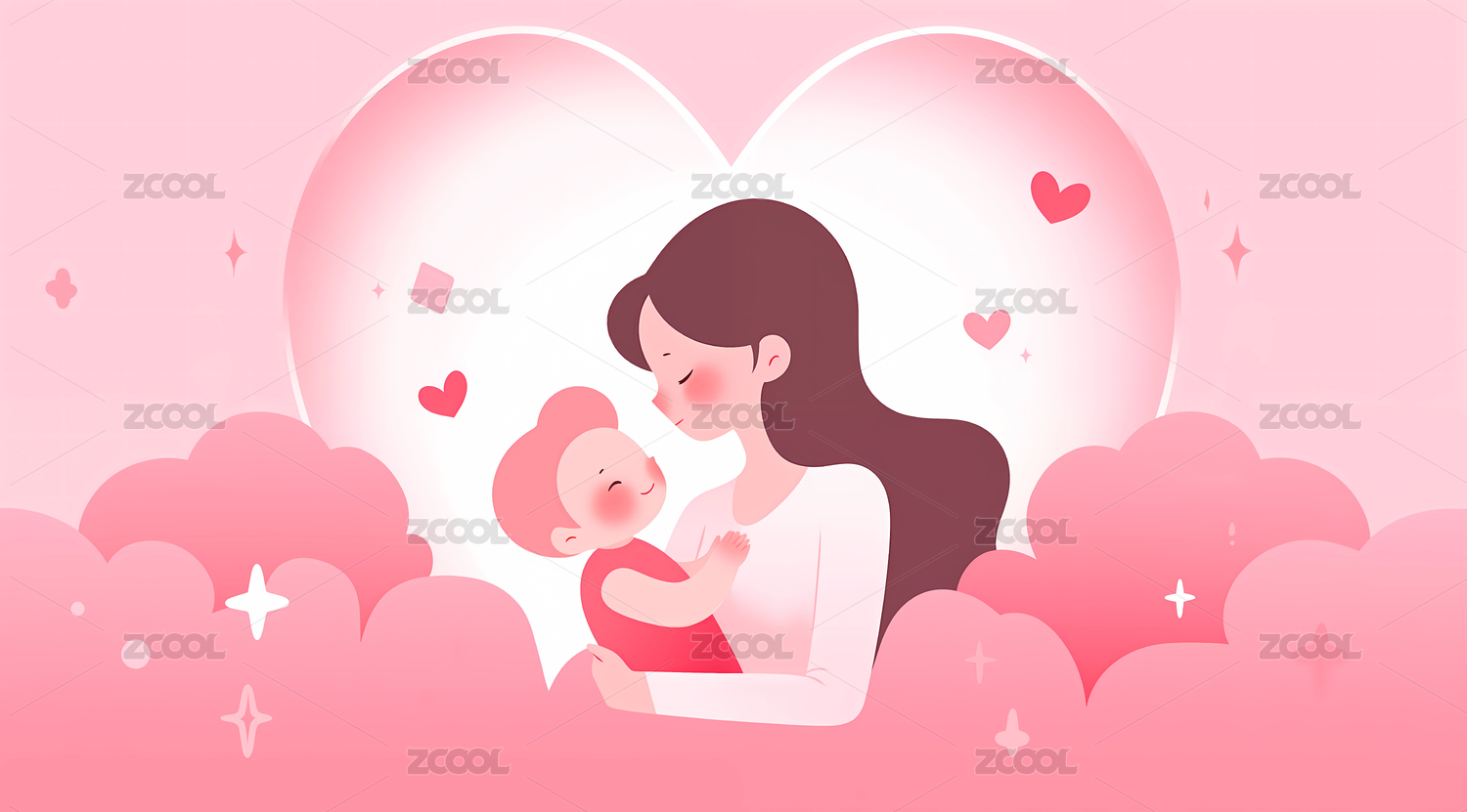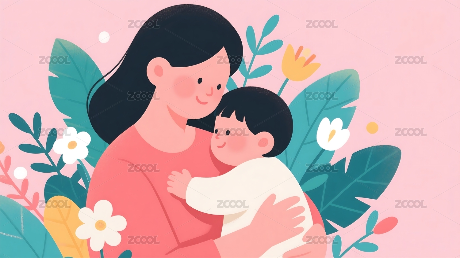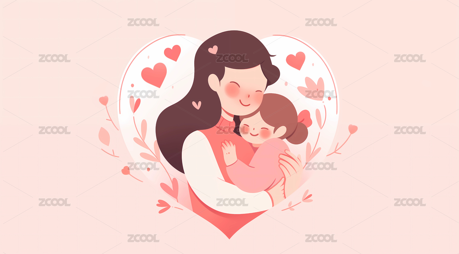 母亲和孩子相拥唯美温馨场景插画