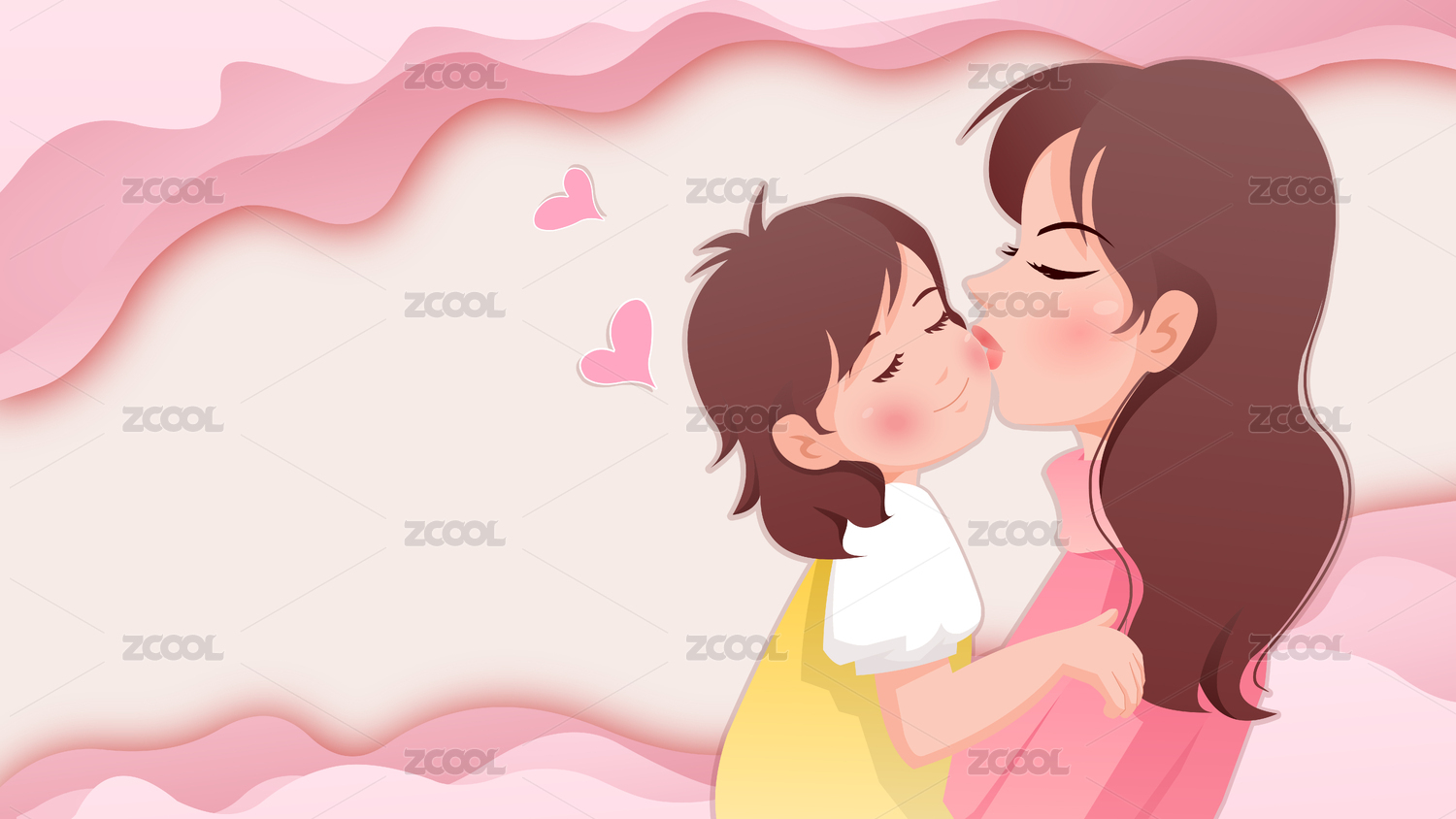 粉色背景,母亲拥抱着女儿,幸福地微笑