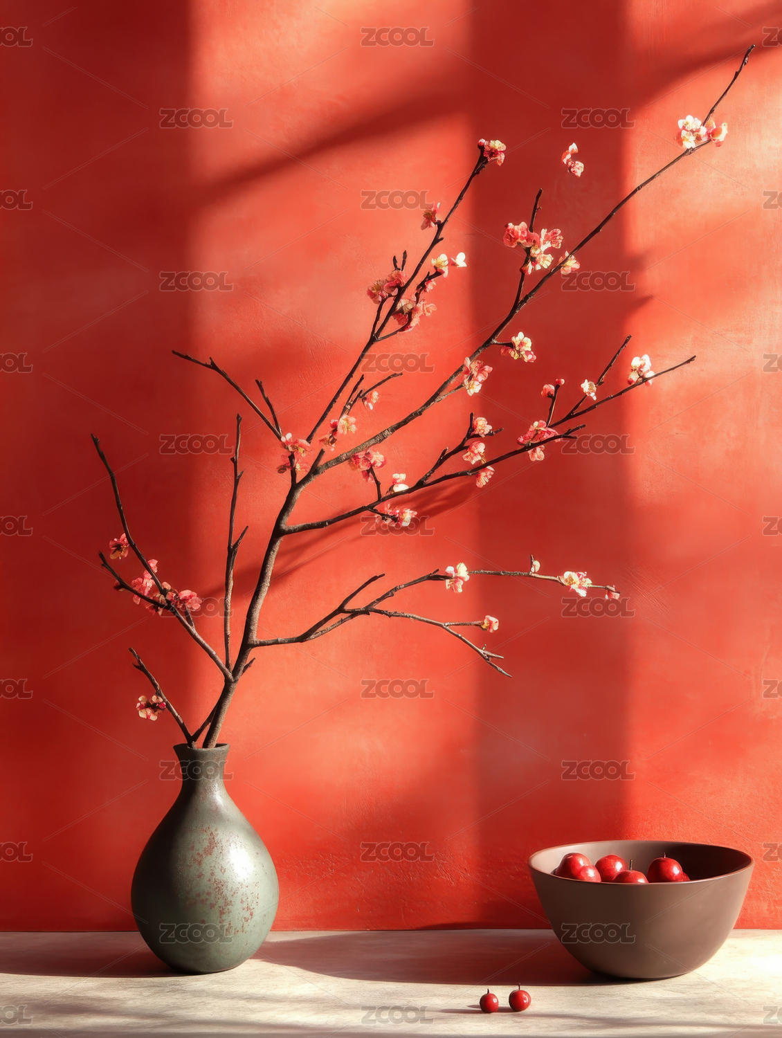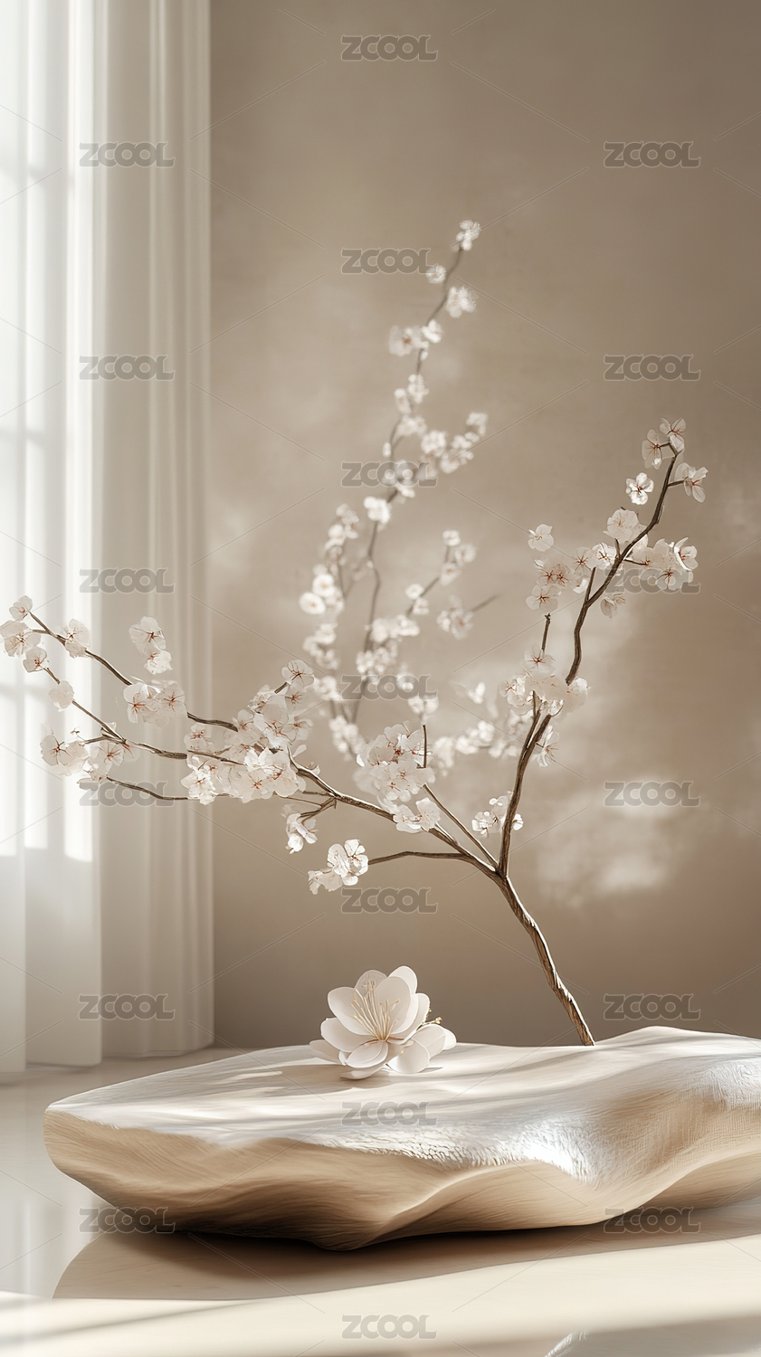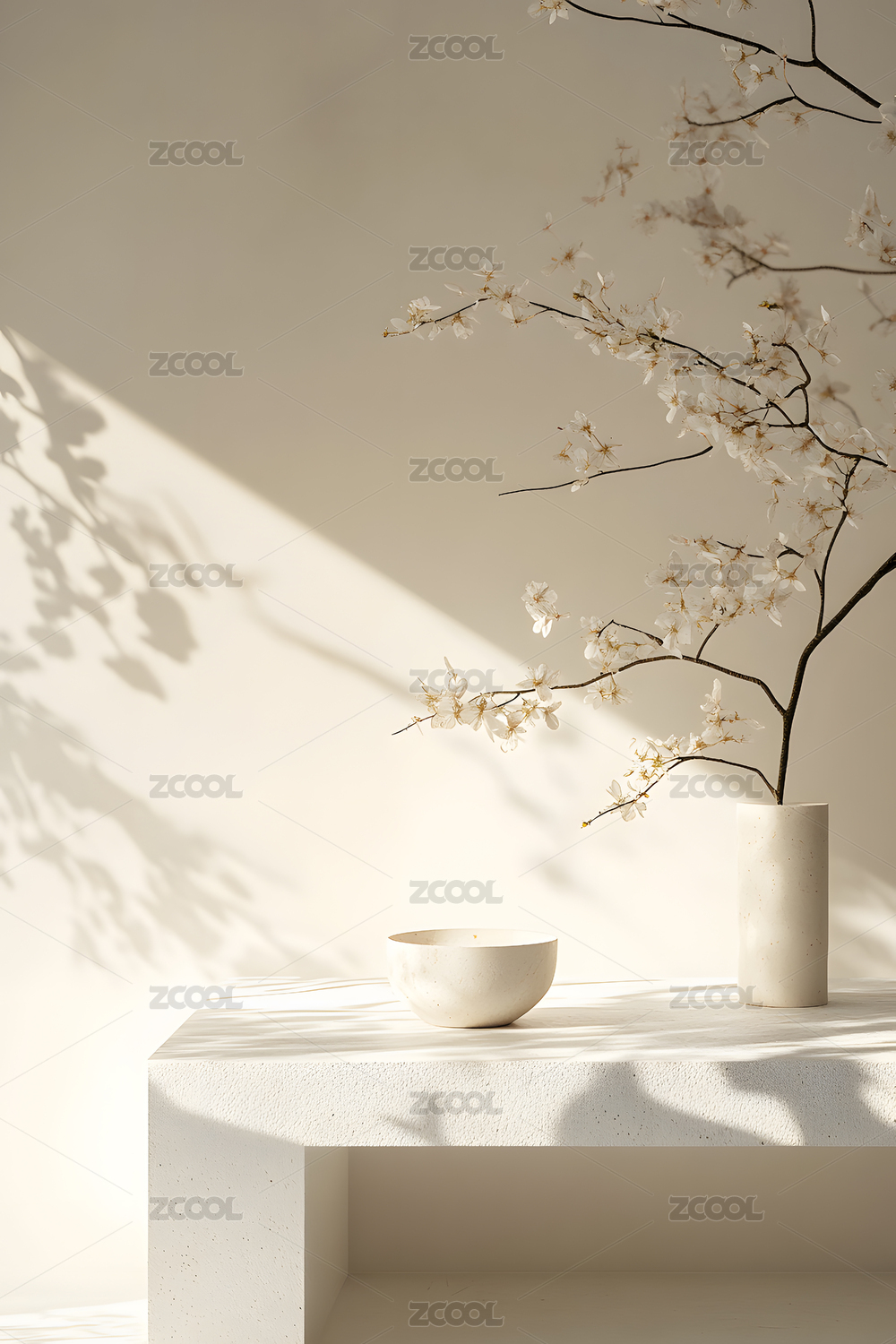 樱花枝与白瓷碗的静谧光影