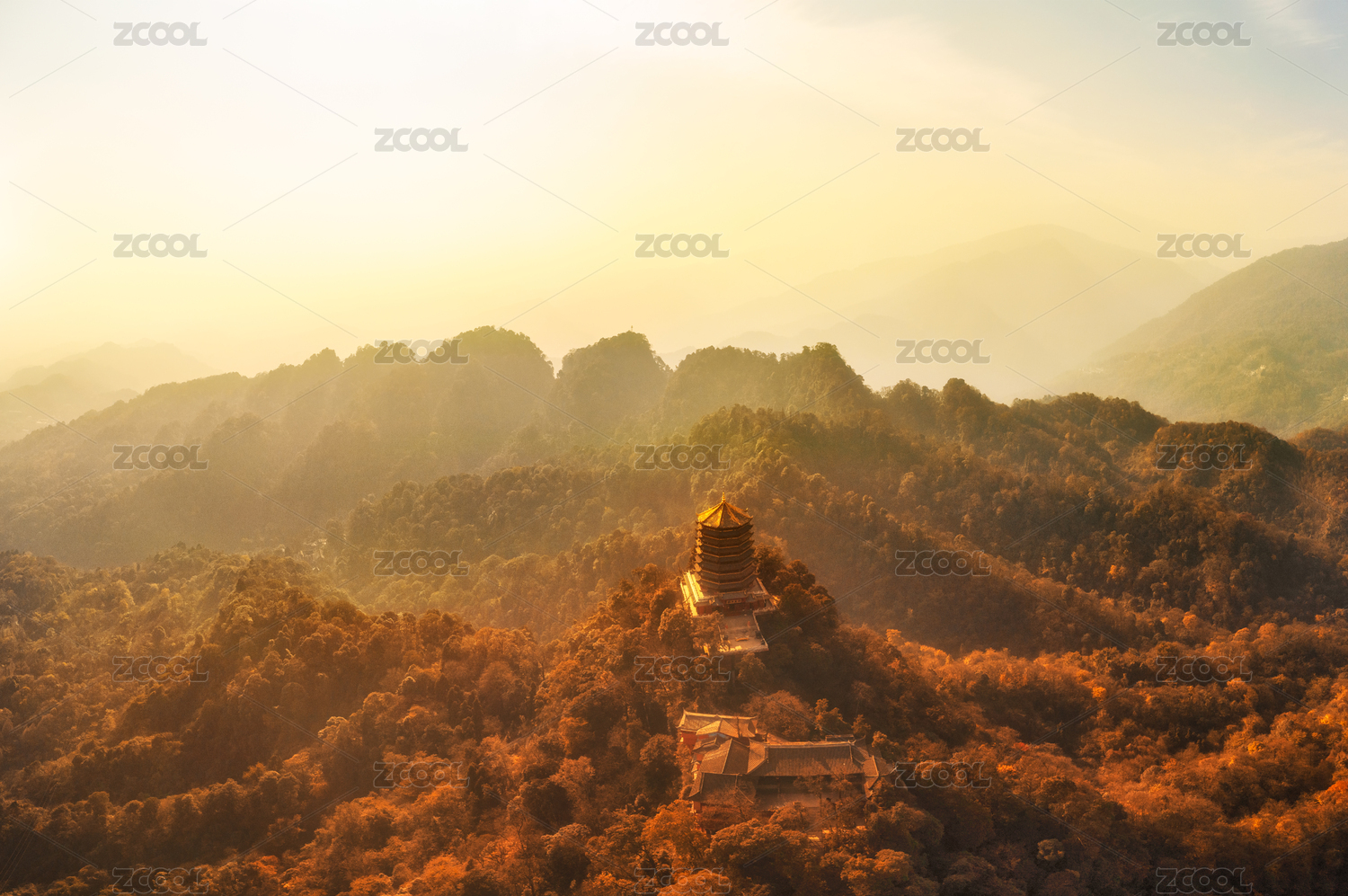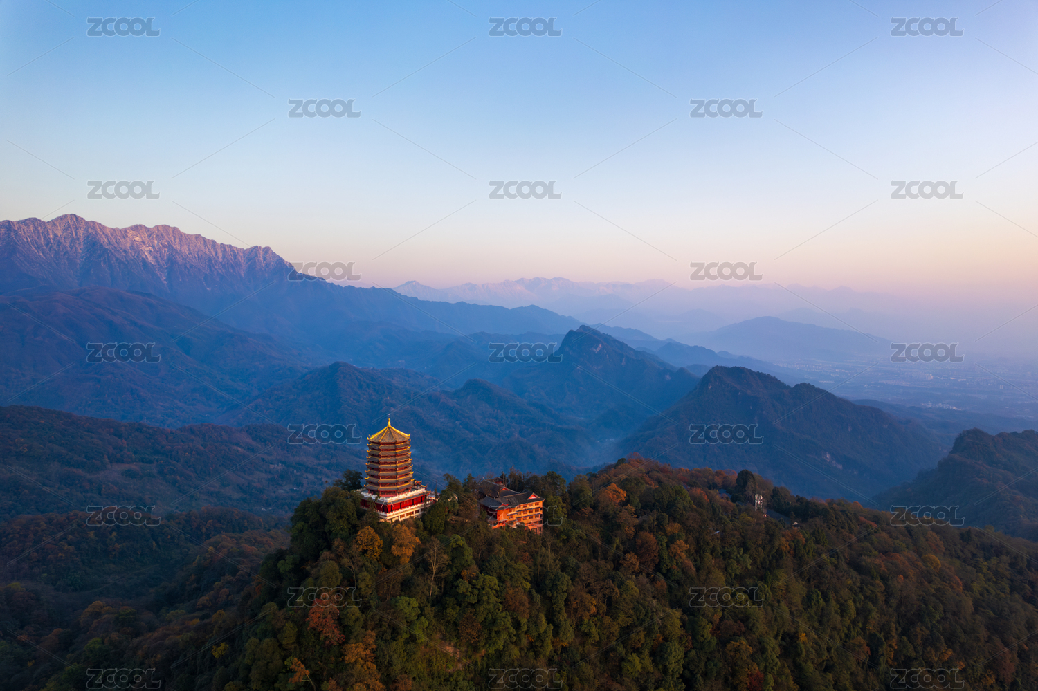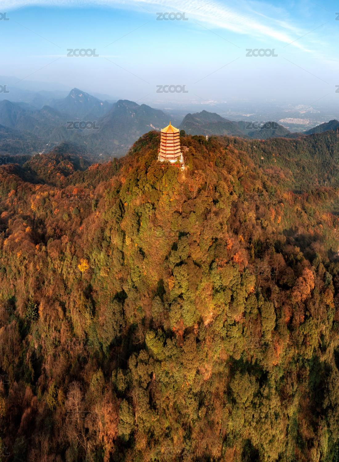中国四川成都青城山老君阁冬季彩林风光航拍