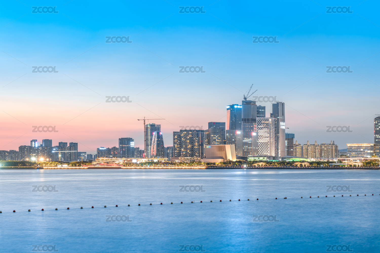 中国广东深圳湾后海的城市建筑群高楼大厦傍晚风光