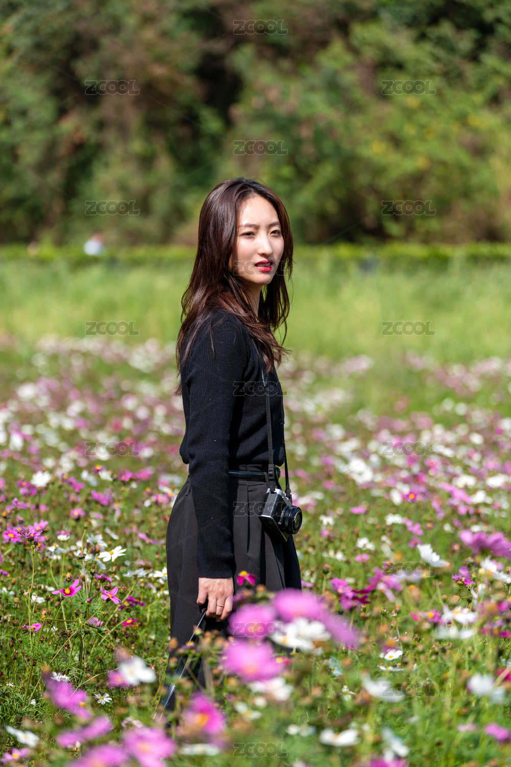 盛夏夕阳照射下花丛草地中的亚洲美女
