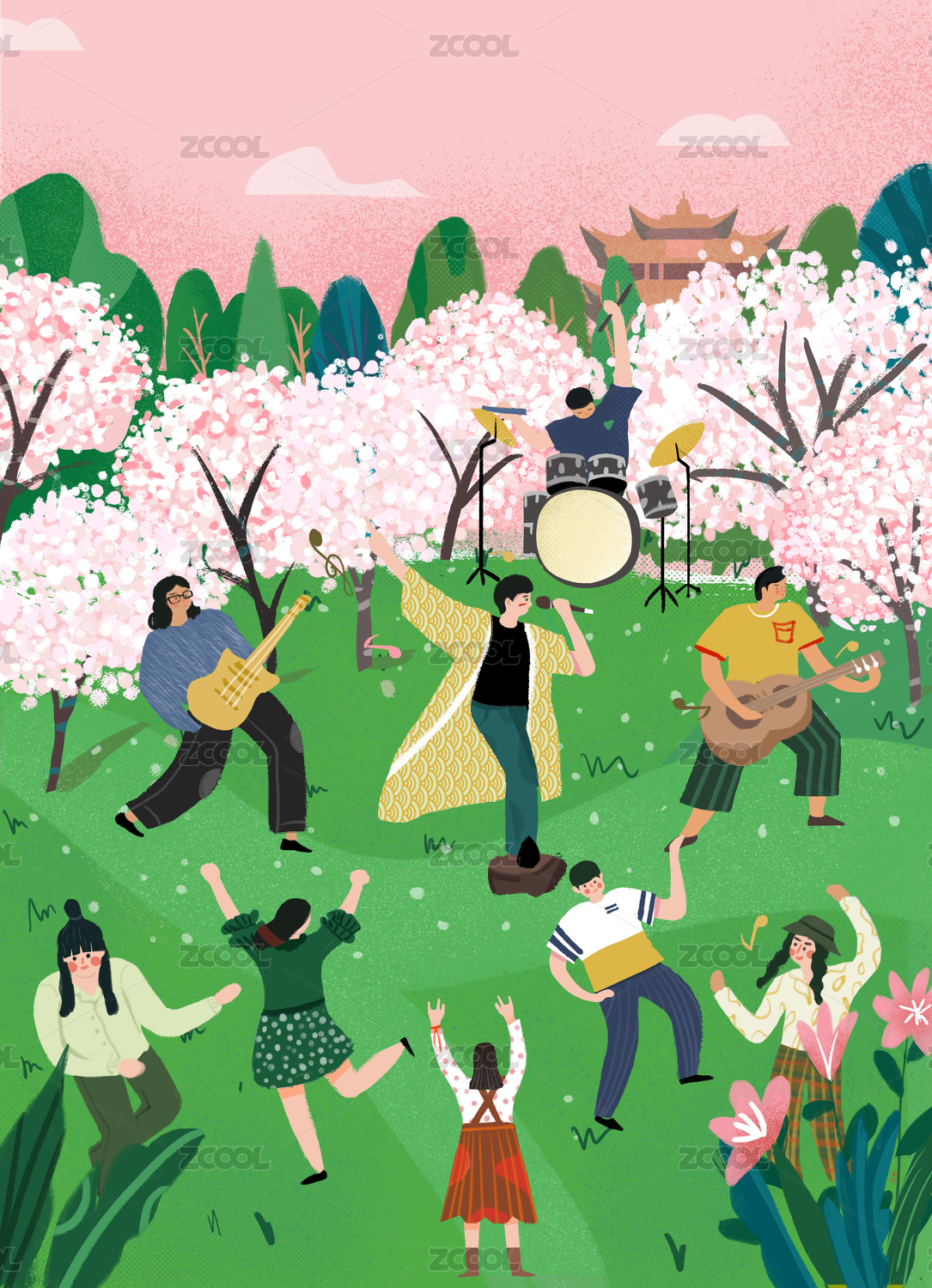 樱花,公园,野餐,玩耍,亲子,插画,卡通