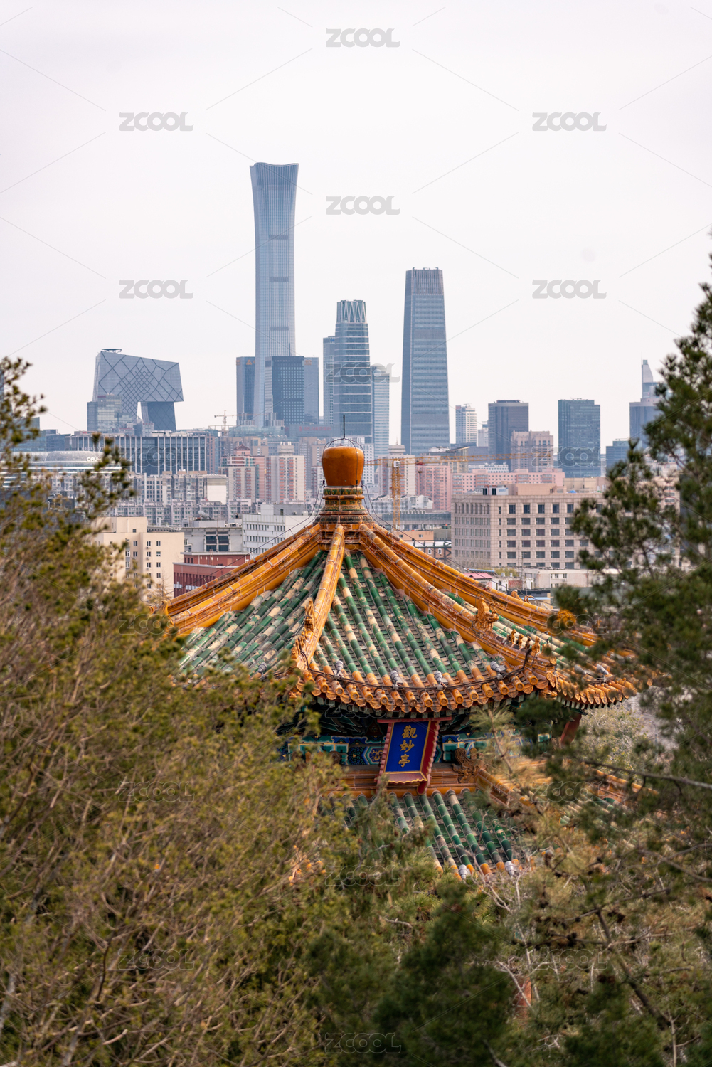 景山公园,远眺,CBD,北京,城市风光,都市,首都,对比,亭台楼阁,高楼大厦