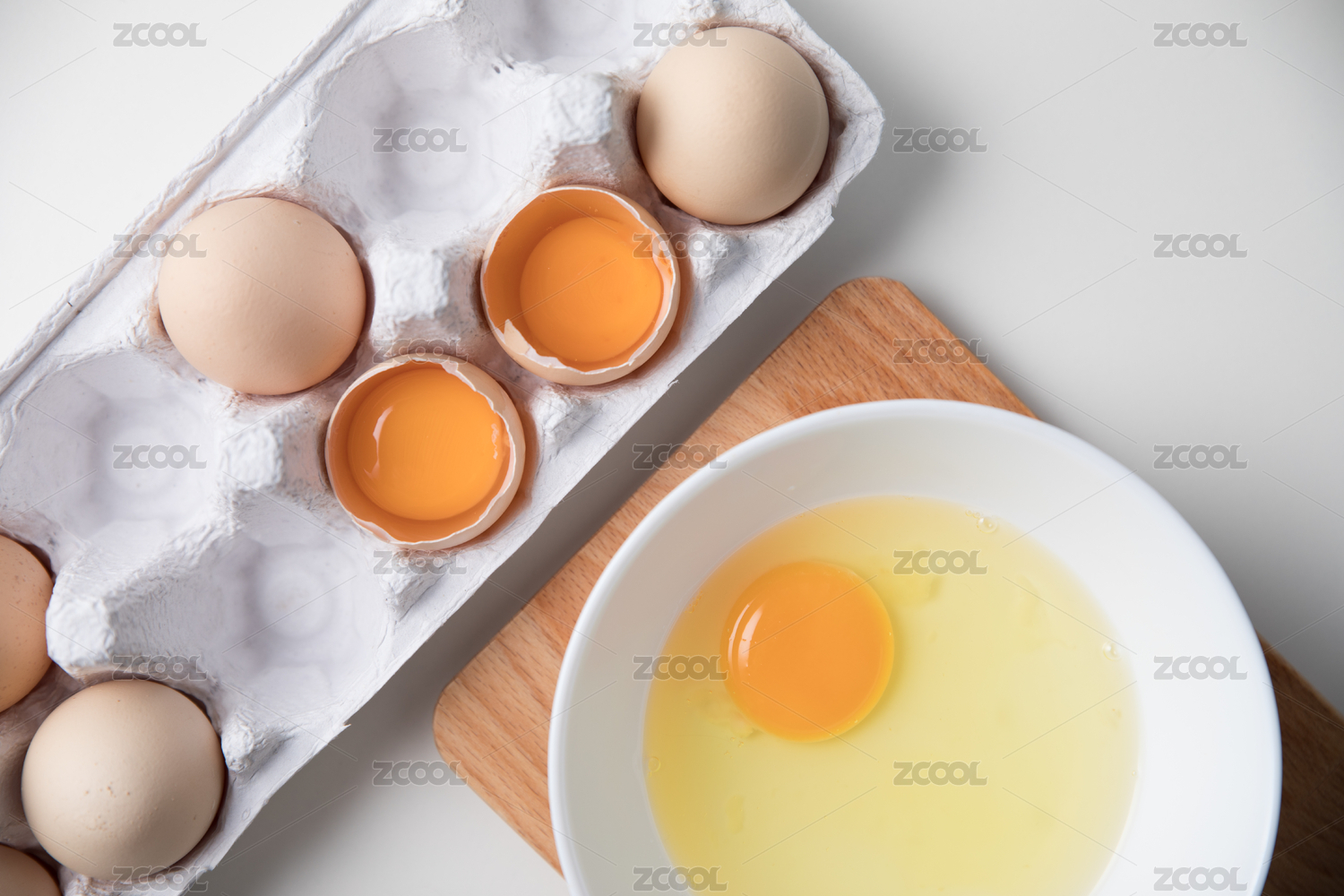 一盒子鸡蛋和一个打开的鸡蛋,露出蛋黄来。